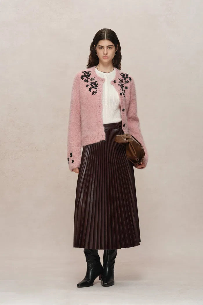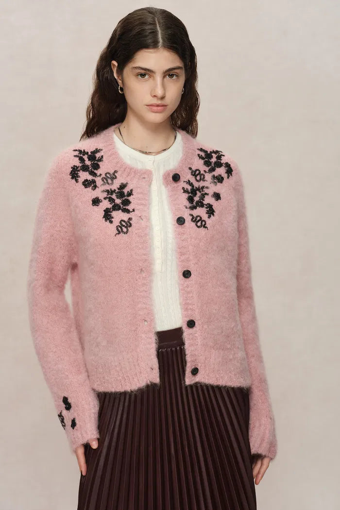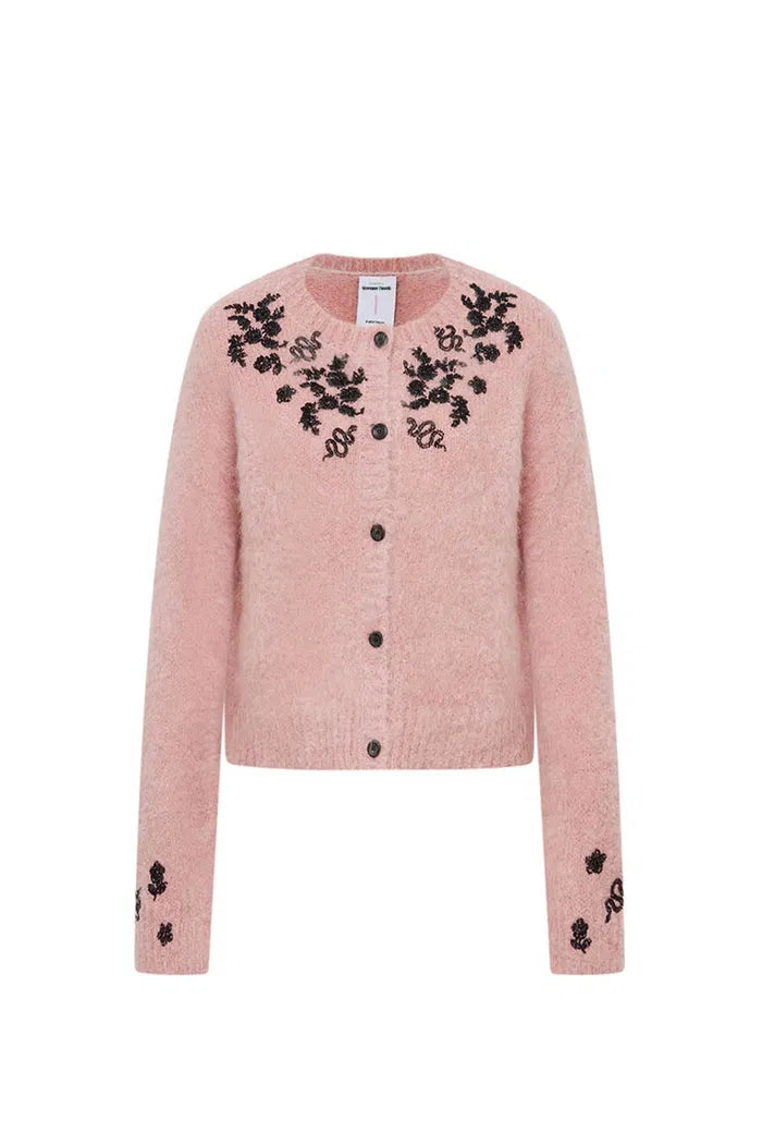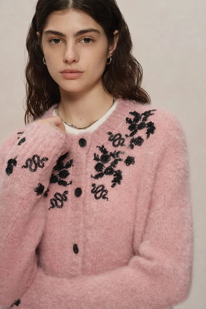 Lucy Pink French Beaded Snake Zodiac Cardigan in Mohair Knit