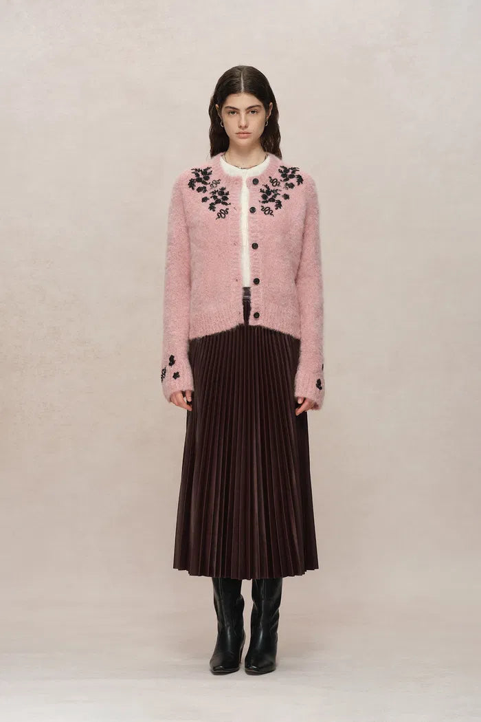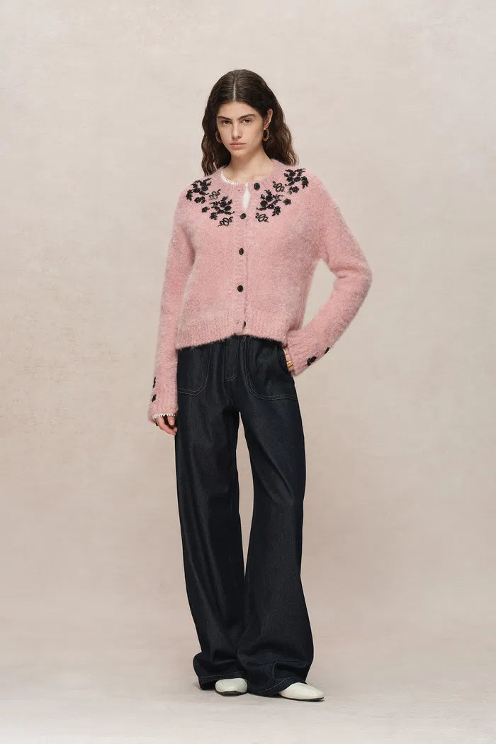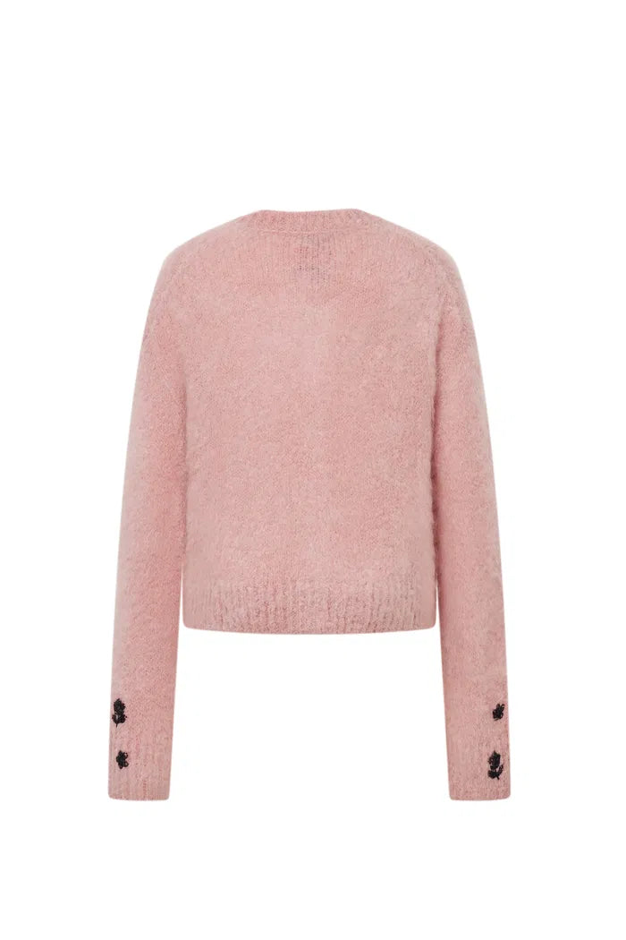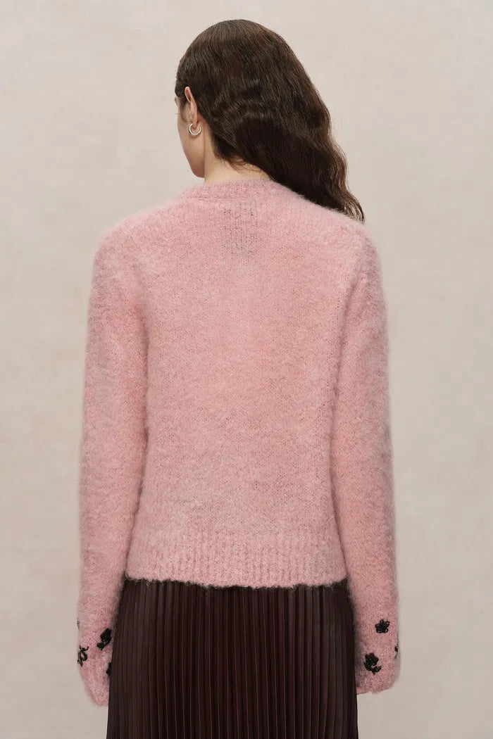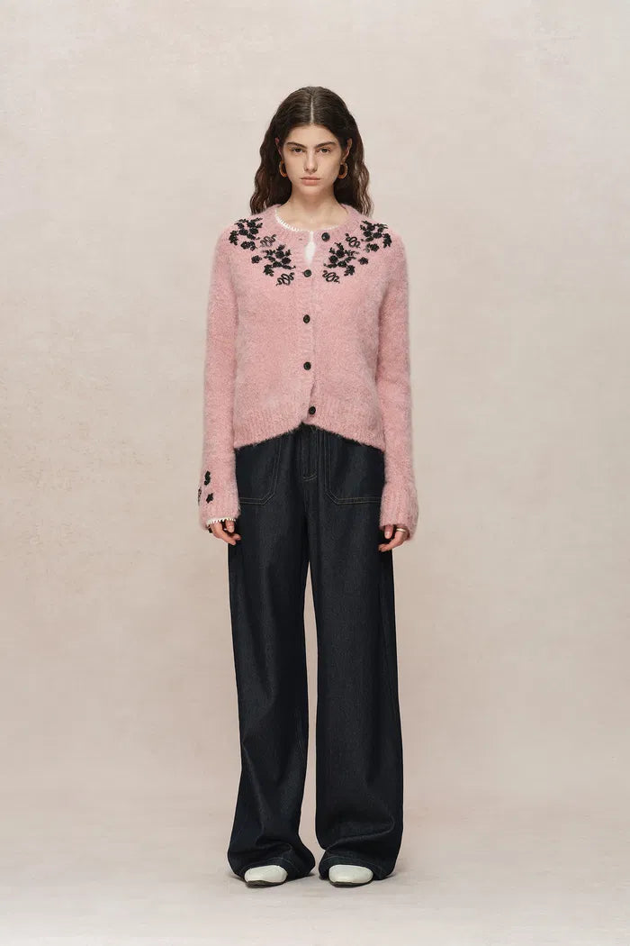 Lucy Pink French Beaded Snake Zodiac Cardigan in Mohair Knit