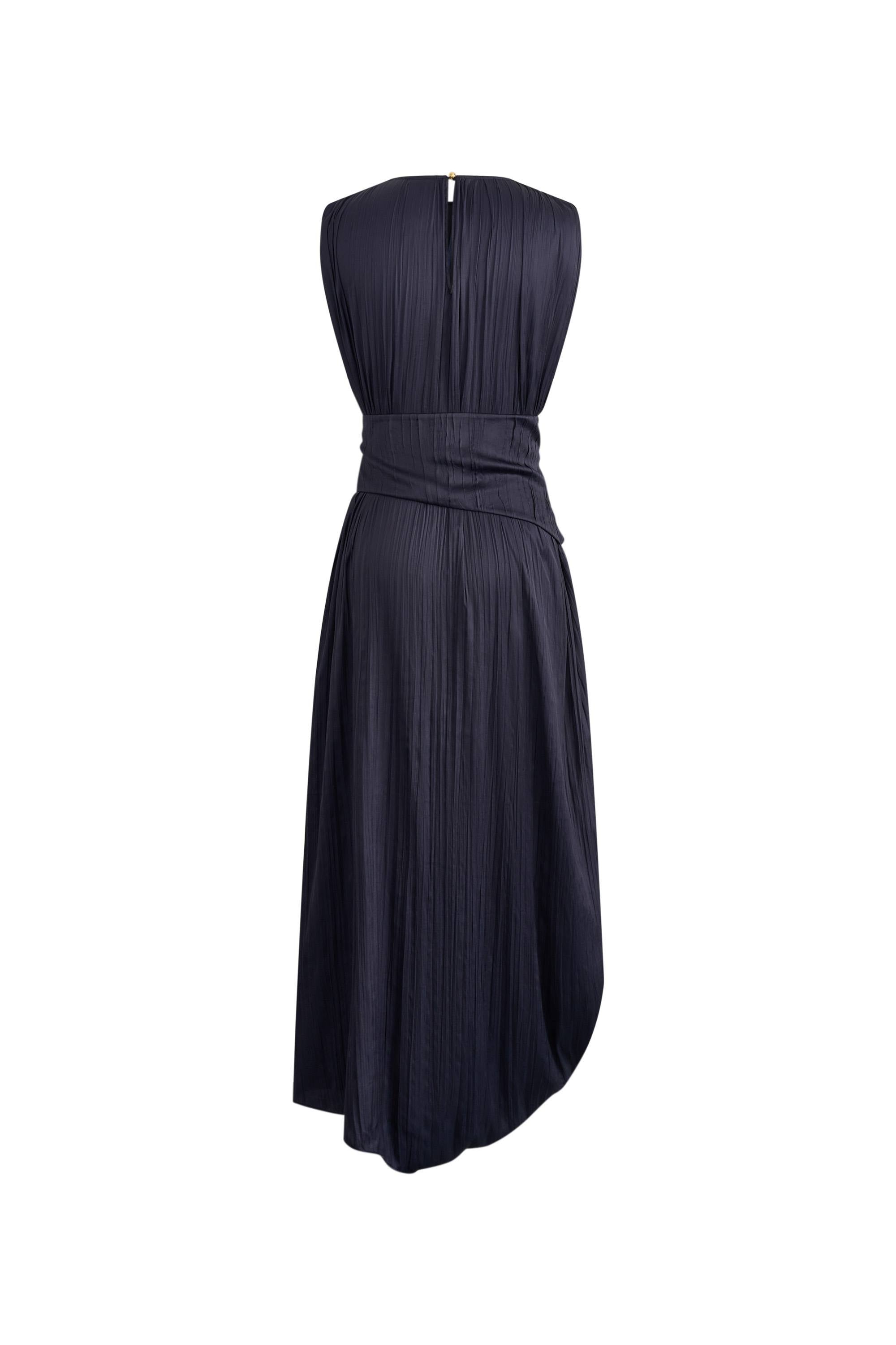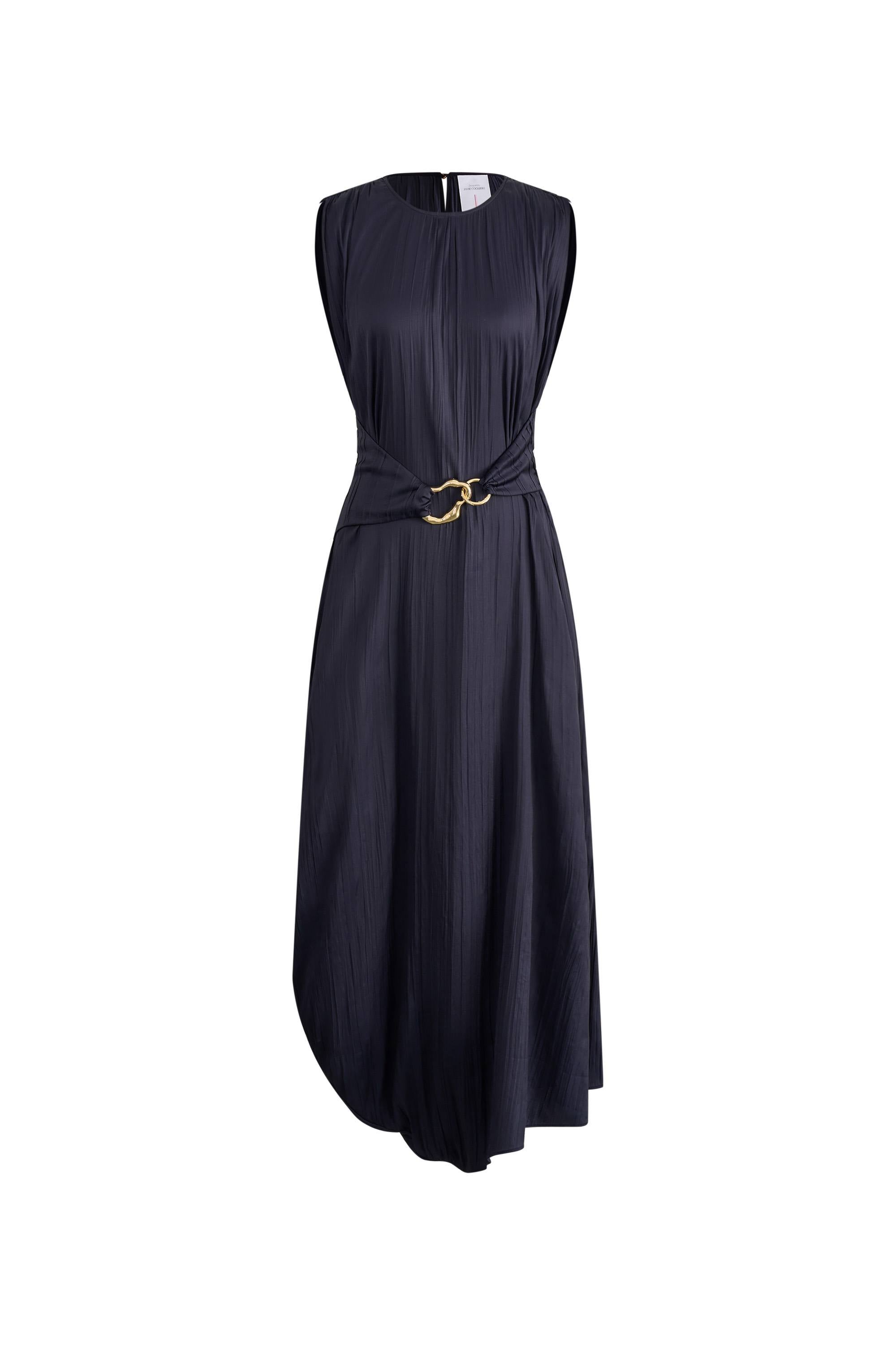 Dieses Kleid mit Boot-Ausschnitt kombiniert intelligent plissierten Satin mit Stretch. Der geschwungene Saum erzeugt eine künstlerische Silhouette, während der maßgeschneiderte Metallgürtel skulpturales Interesse hinzufügt. Mitternachtsblau wirkt sowohl klassisch als auch modern.
