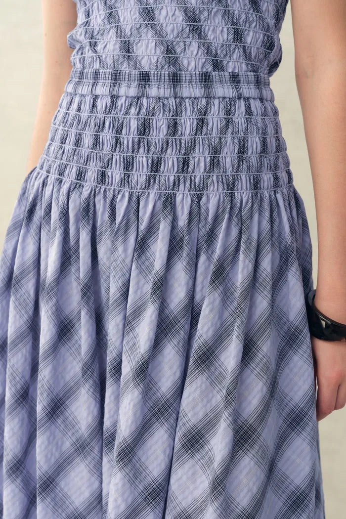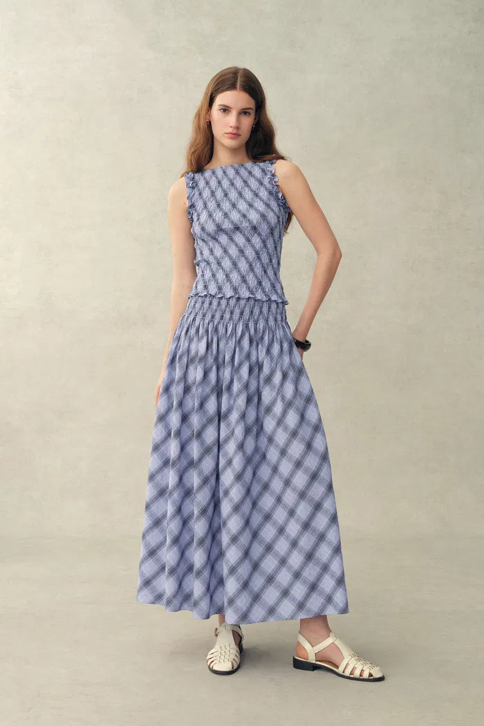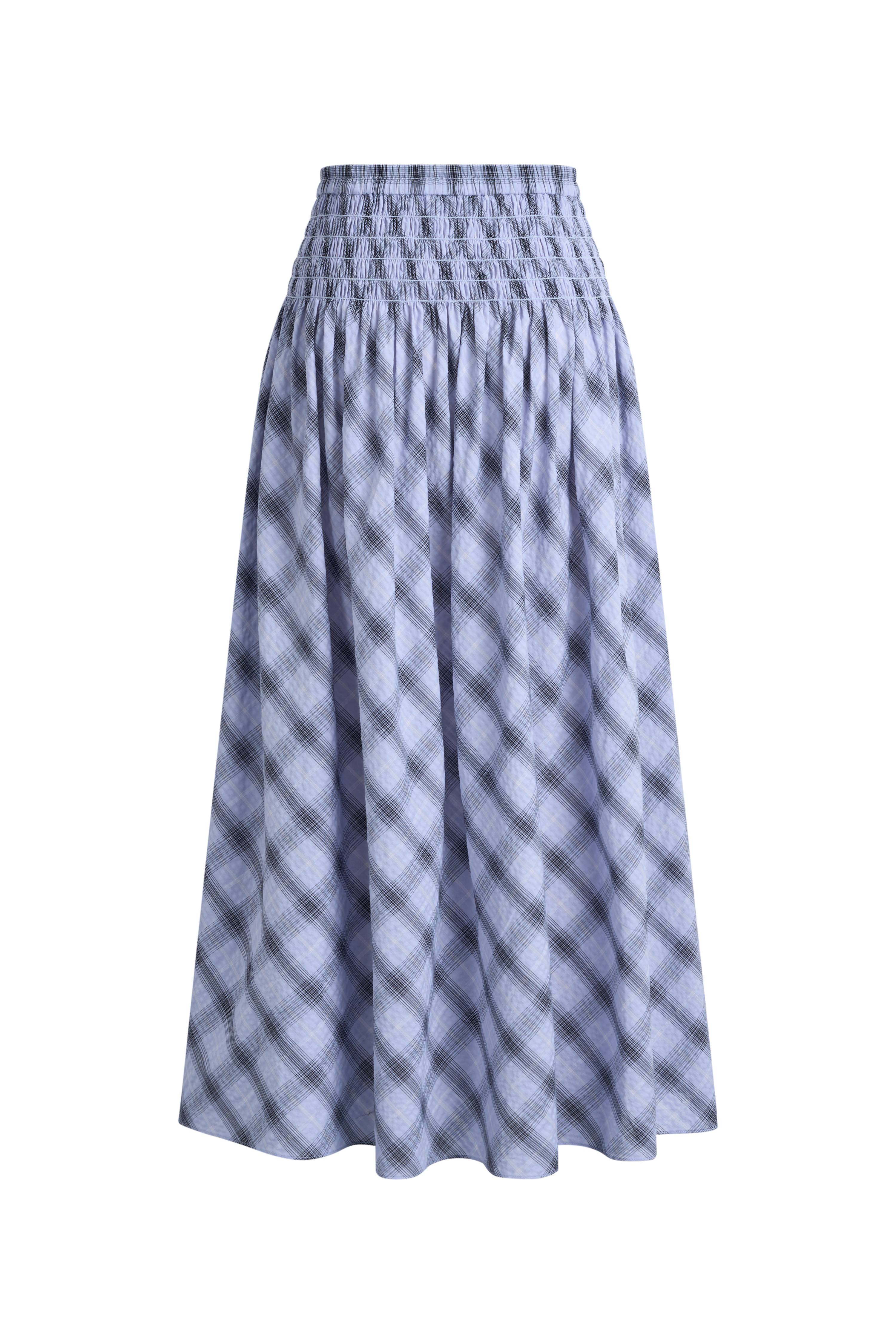 Dieser bauschige Baumwollrock verfügt über weiches Raffen an Taille und Hüften für eine engere Passform mit etwas Stretch. Die leicht ausgestellte Form hält die Linie schlicht, während das blau-weiße Karo einen frischen Vintage-Akzent für die Sommergarderobe setzt.