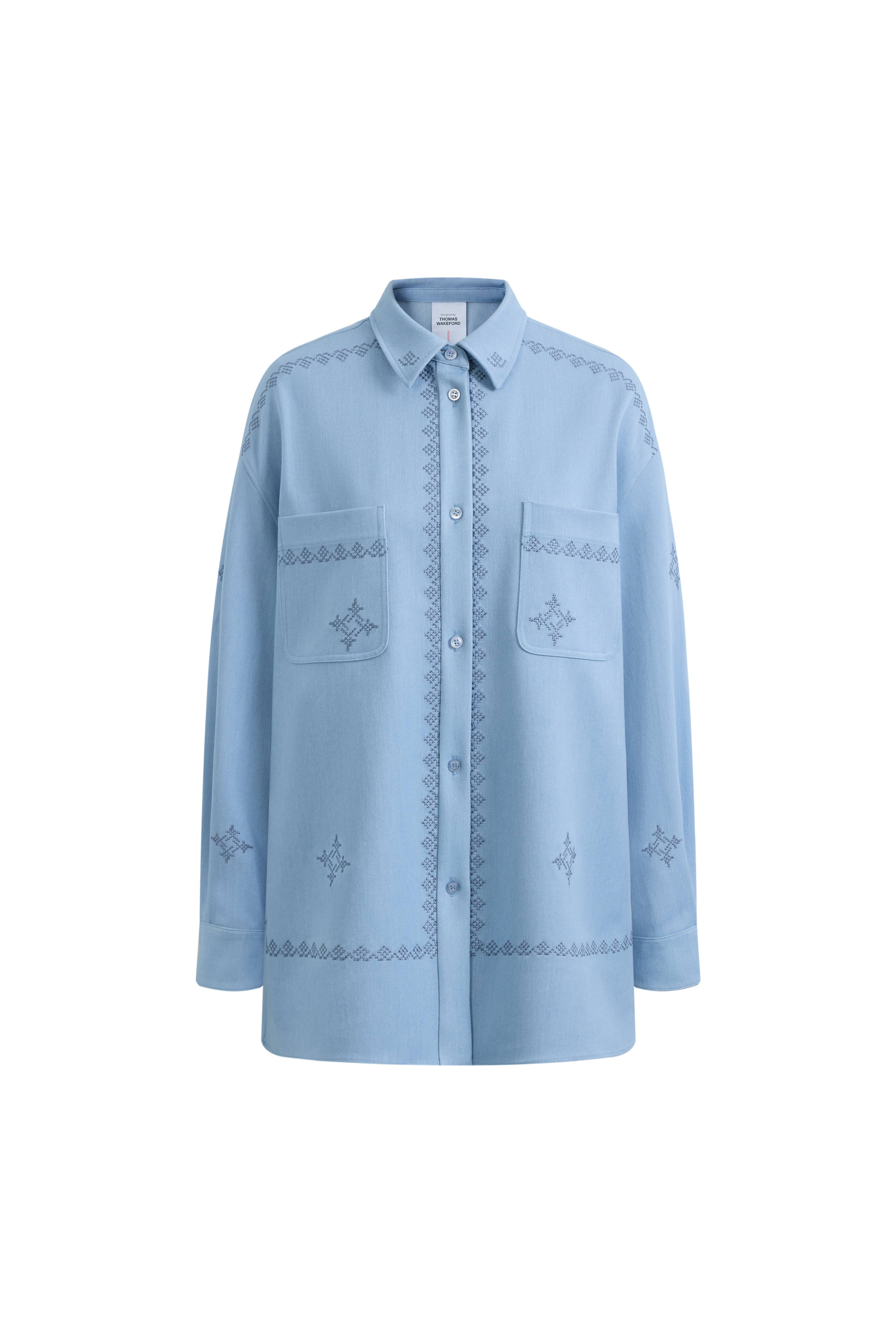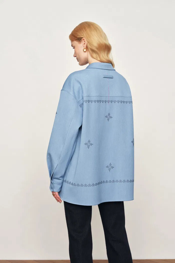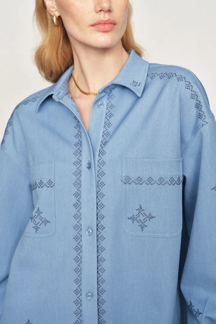 Dieses oversized Jeanshemd ist mit traditionellen Kreuzstich-Motiven verziert und vermittelt ein modernes „urban nomad“-Gefühl. Der großzügige Schnitt eignet sich perfekt als saisonale leichte Jacke oder als auffälliges Hemd mit Knopfleiste.