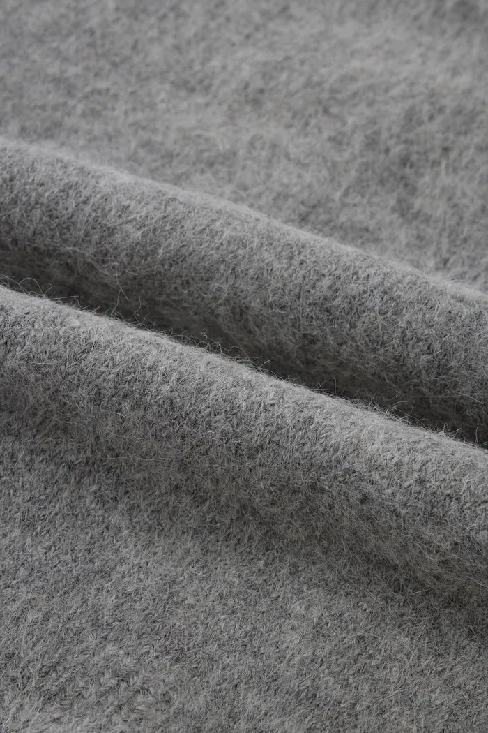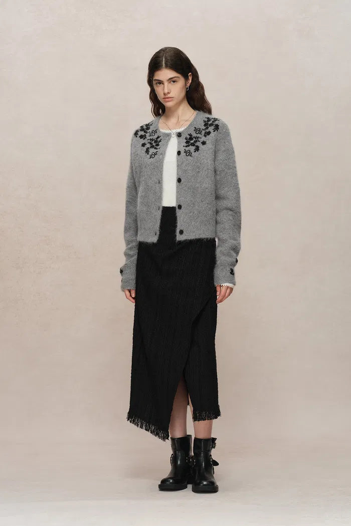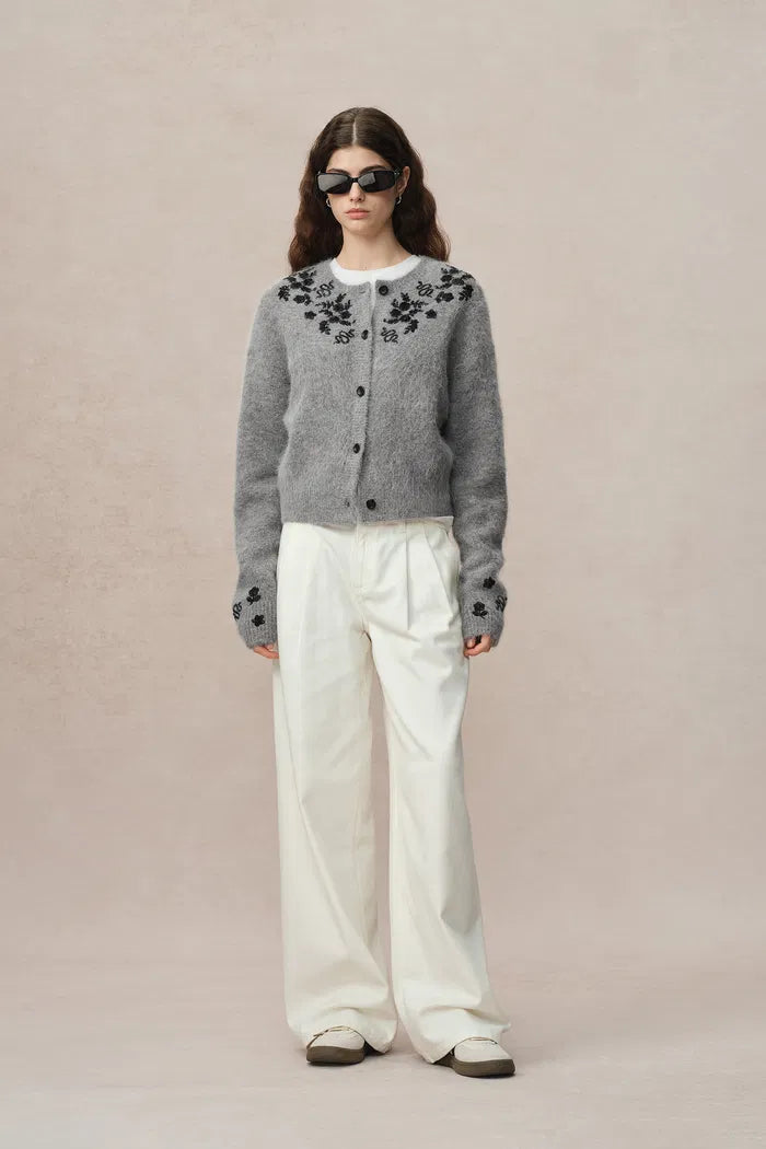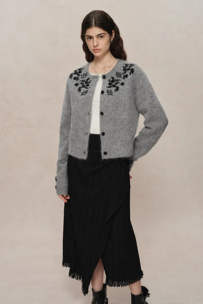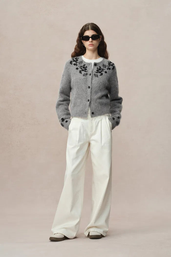Rauchgraues Alpaka bietet eine zurückhaltendere Variante der Verzierung. Die gleiche filigrane Perlenarbeit erzählt hier ihre Geschichte leiser. Eine verkürzte Passform sorgt dafür, dass die detaillierte Arbeit im Mittelpunkt steht.