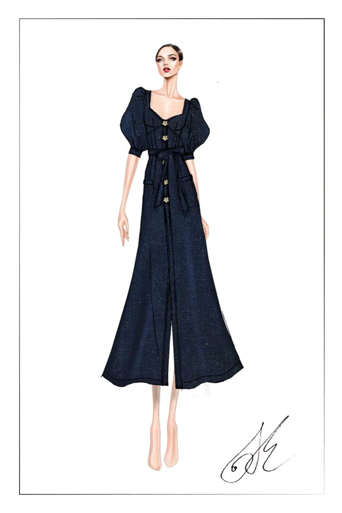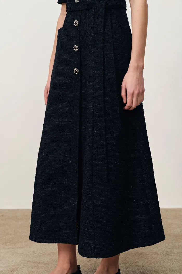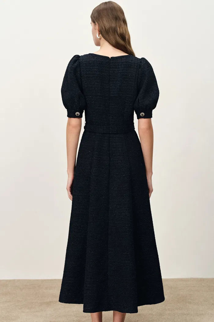 Sofia Maxikleid mit Puffärmeln aus leichtem Tweed-Mix