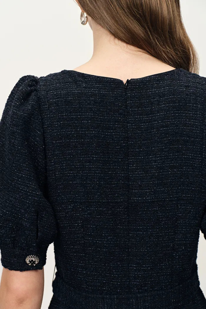 Tweed, der zu einem Herzausschnitt geformt ist, mit dezentem Schultervolumen, das den Oberkörper hebt. Die definierte Taille und der klare, fließende Rock balancieren sich aus und verleihen dem klassischen Tweed für festliche Anlässe eine moderne, präzise Note.