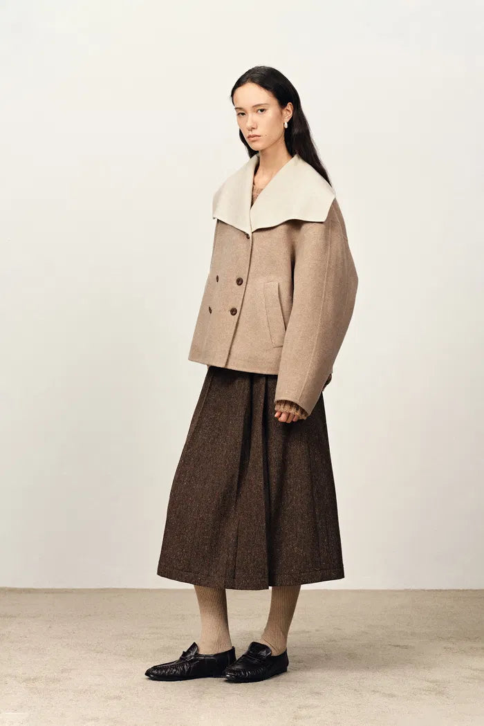 Weiche doppelseitige Wolle interpretiert den klassischen Peacoat neu durch dramatischen Schalkragen, der schöne Zweifarb-Effekte zeigt. Geflochtene Lederknöpfe wirken luxuriös. Die verkürzte Länge lässt sich mühelos über allem tragen.