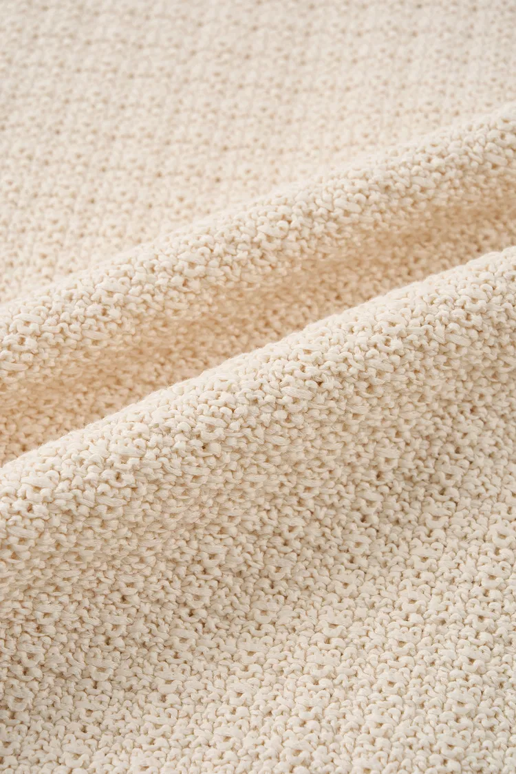 Ausgewähltes Baumwollgarn mit weichem, feinem Griff und natürlicher Atmungsaktivität. Sein boucléartiger Charakter schafft eine dimensionale Stricktextur und bleibt dabei angenehm auf der Haut. Dicht genug, um gepflegt auszusehen, aber weich genug, um sich leicht anzufühlen, behält es eine raffinierte Form ohne steif zu wirken.