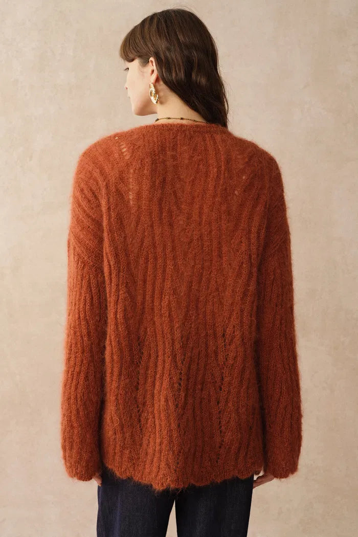 Aki Gezackter Ausschnitt Transparenter Cardigan in leichtem Mohair Zopfmuster