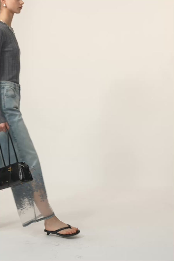 Diese gerade geschnittenen, gekürzten Jeans zeigen eine "Burnout"-Mesh-Technik, die versteckte Blumenmuster enthüllt. Die transparenten Texturen und das silberne Taillendetail verleihen einem einfachen Alltagsklassiker eine handwerkliche Luxusnote.