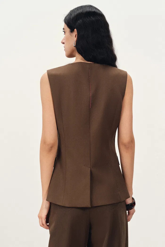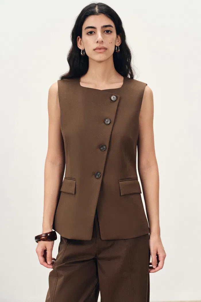 Die asymmetrische Knopfleiste verleiht diesem ärmellosen Top mit quadratischem Ausschnitt eine moderne Note, während geschwungene Nahtdetails und der Rückenschlitz für bequemes Sitzen sorgen. Gefertigt aus leichtem Anzugstoff, der sich hervorragend zum Schichten eignet.