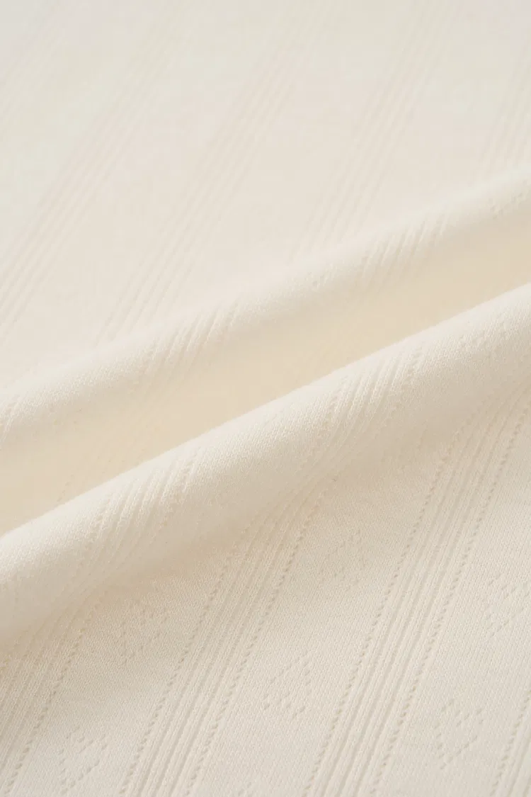 Dieses T-Shirt verfügt über hautfreundliches, elastisches Strickmaterial in Nude, ein verspieltes Hohlherz-Jacquardmuster und einen französischen Rundhalsausschnitt mit kurzen Ärmeln. Es bietet atmungsaktiven Komfort, ein leichtes, aber dennoch substantielles Tragegefühl und ein Spitzenlogo-Detail, was es zu einer einfachen Alltagswahl für Frühjahrs- und Sommergarderoben macht.