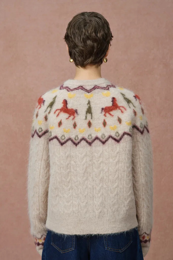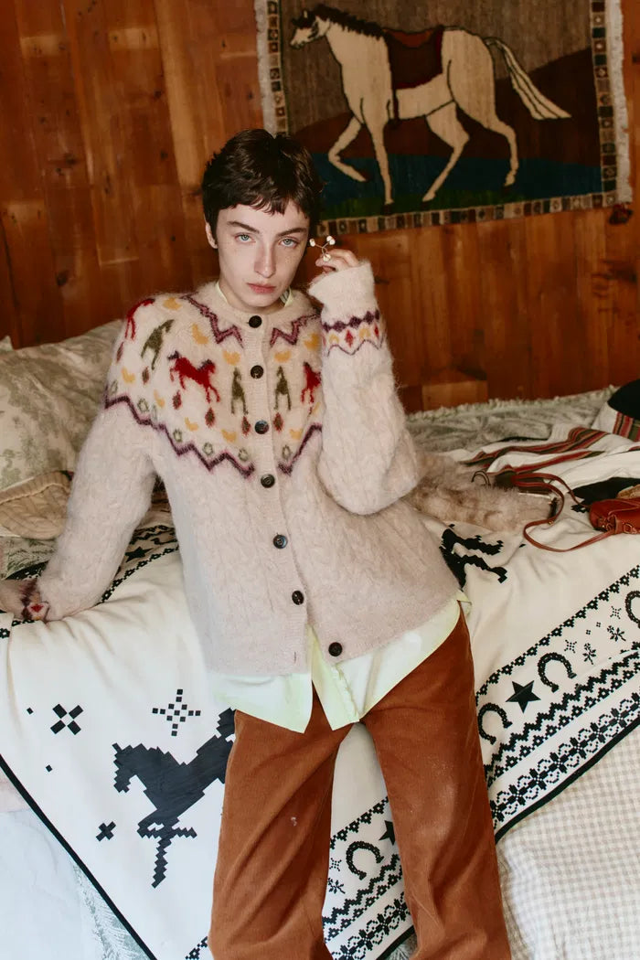 Eine Fair Isle Strickjacke, inspiriert von Hidatsa-Stammeskunst, mit einem handgezeichneten Pony-Motiv, das traditionell Mut und Ehre symbolisiert. Das Garnmischstrickmuster verweist auf traditionelles Handwerk mit modernem Schnitt.