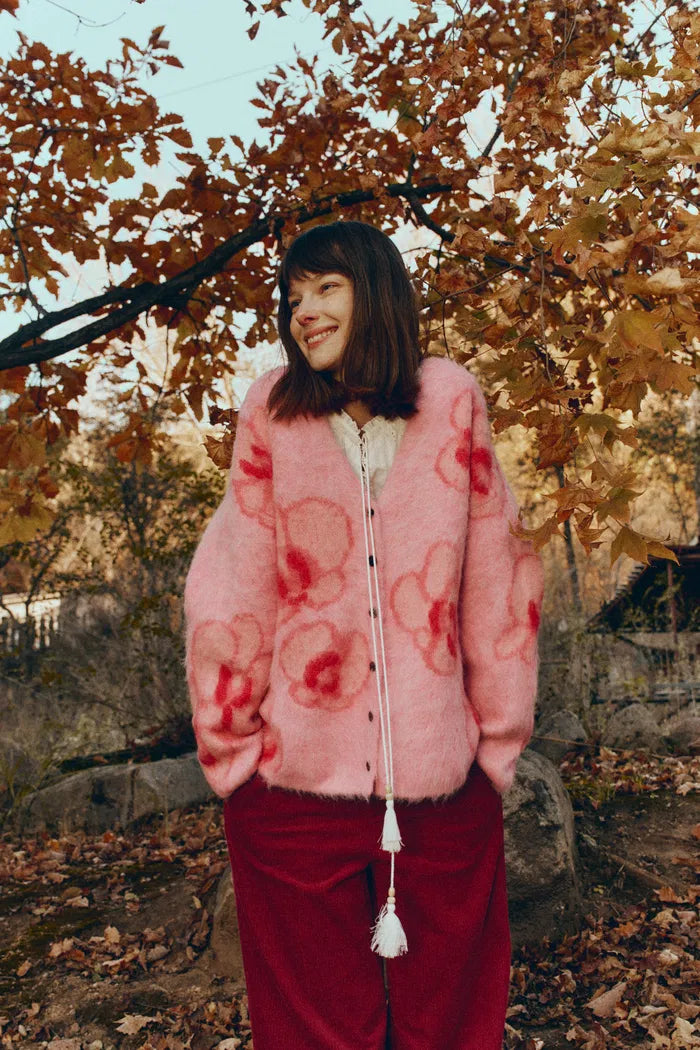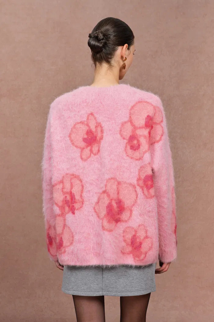 Sanfte Orchideenblüten, gewebt aus gebürstetem Alpakagarn, fangen die Weichheit des ersten Lichts ein. Der roséfarbene Ton hebt den Teint hervor, während der luftige, übergroße Schnitt mit stiller Eleganz fällt – leicht, warm und zart fühlbar.