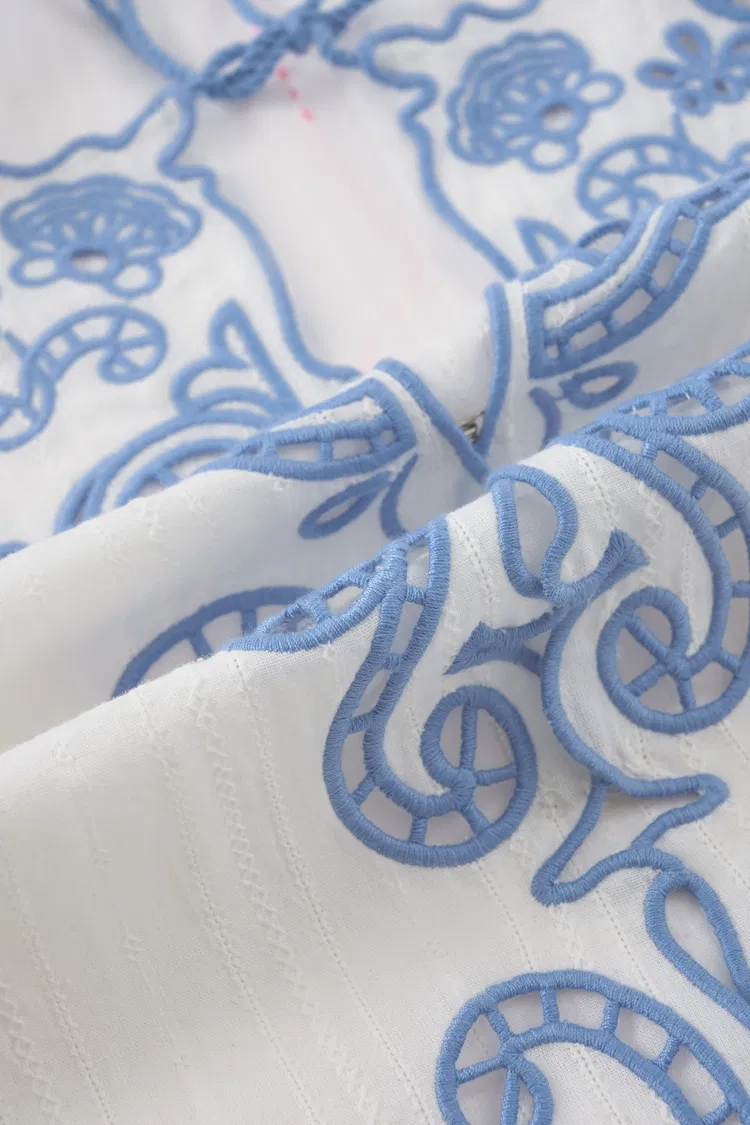 Dieses bestickte Hemd wirkt entspannt, aber dennoch durchdacht, mit lockerem Schnitt, subtiler Textur und verstellbarem Band vorne. Es vermittelt eine leichte Urlaubsstimmung, funktioniert aber auch gut mit einfachen Tops, Röcken oder Jeans zu Hause.