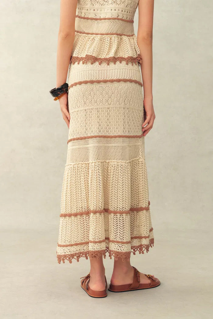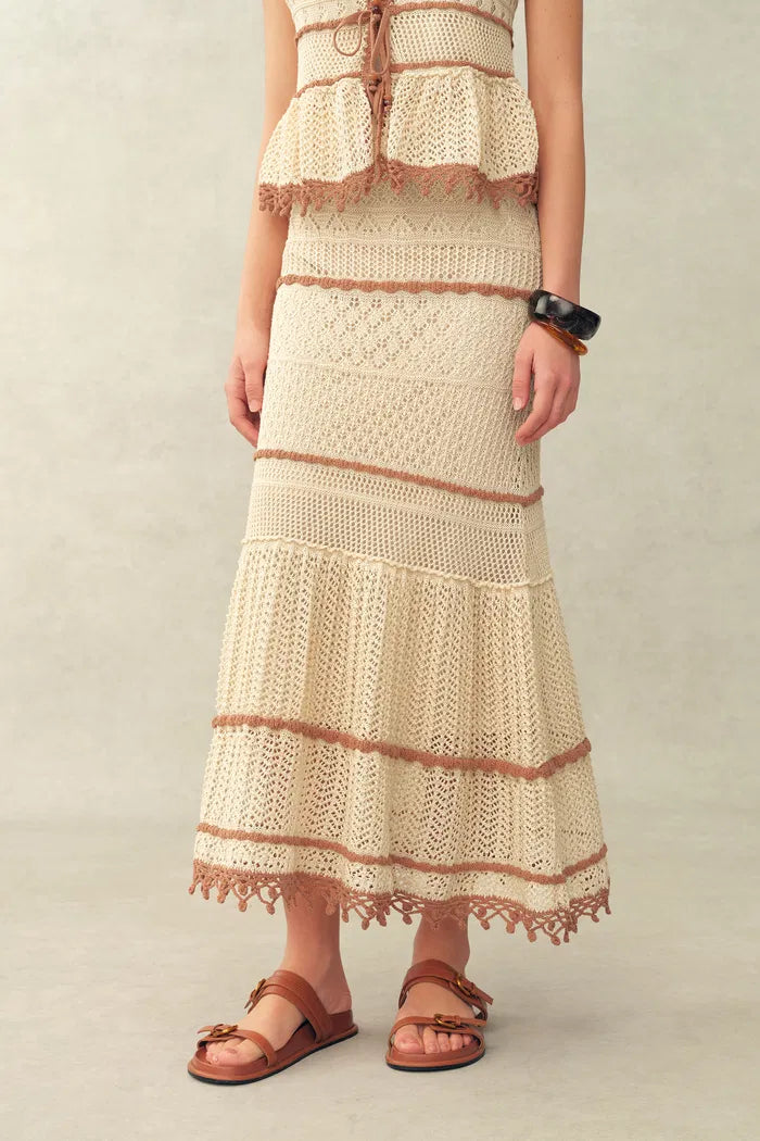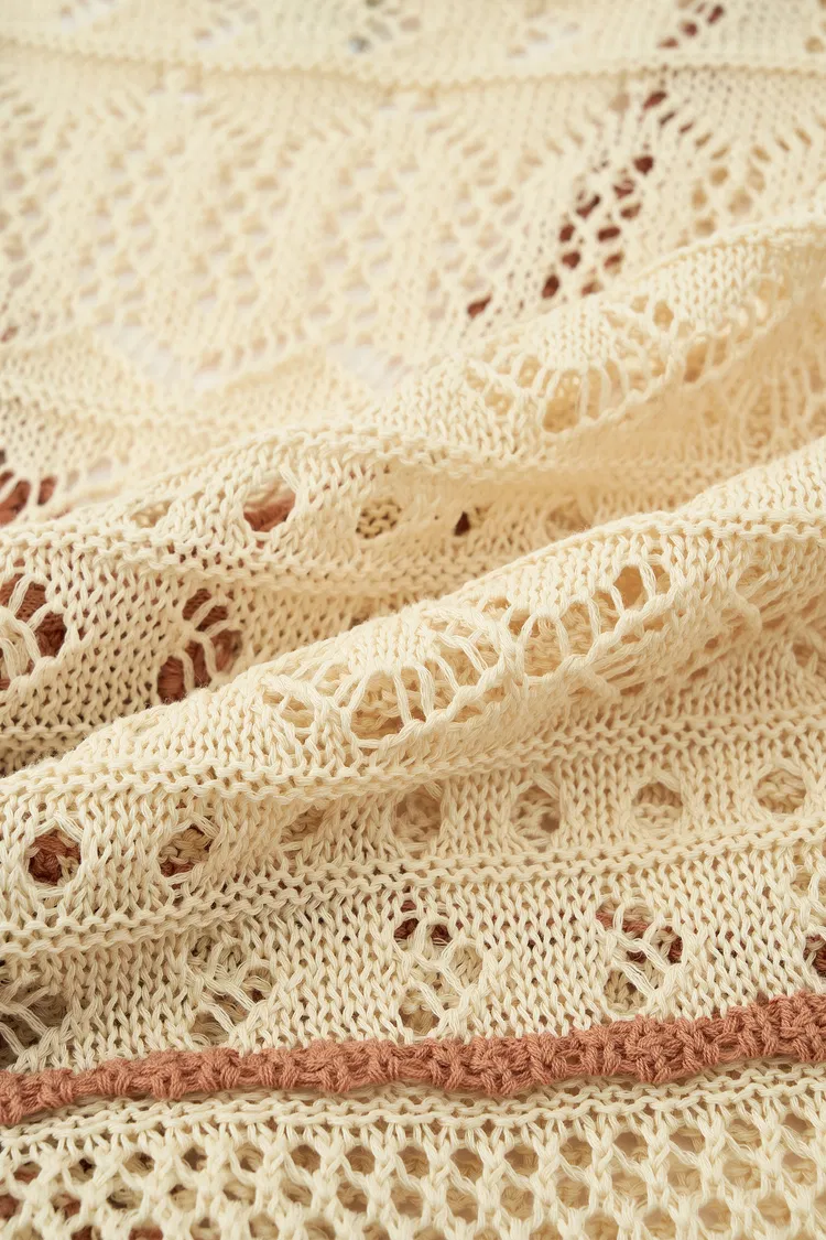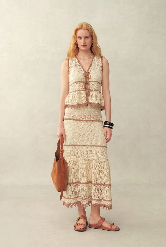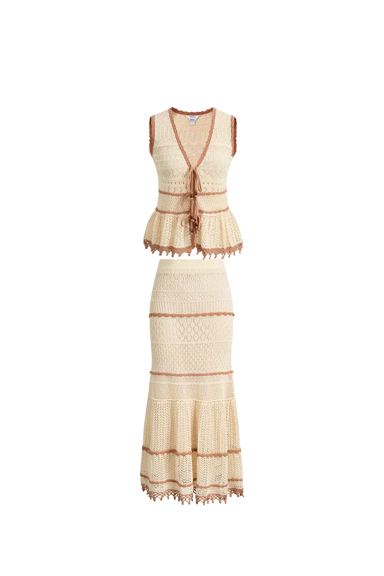 Dieses koordinierte Strickset besteht aus einer Weste mit Bindeband vorne und einem flexiblen Meerjungfrauenrock. Die kontrastierenden Häkelmaschen und Lochmuster schaffen einen modernen, energiegeladenen Look, der weich und angenehm auf der Haut bleibt.