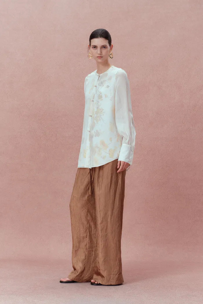 Dieses Hemd verwandelt Aquarellmalereien in tragbare Kunst. Handbemalte Mohnblumen unter Seidentüll verleihen Tiefe, während der traditionelle chinesische Kragen für Struktur sorgt. Handgemachte Froschknöpfe lösen sich nicht.
