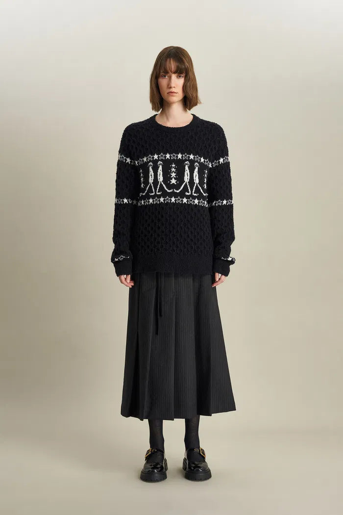 Dieser Pullover verbindet Fair-Isle-Tradition mit Verspieltheit. Pompons und Zopfmuster sind durchdacht eingearbeitet. Fallende Sternmotive sind strategisch platziert, um eine tragbare Traumlandschaft zu schaffen.