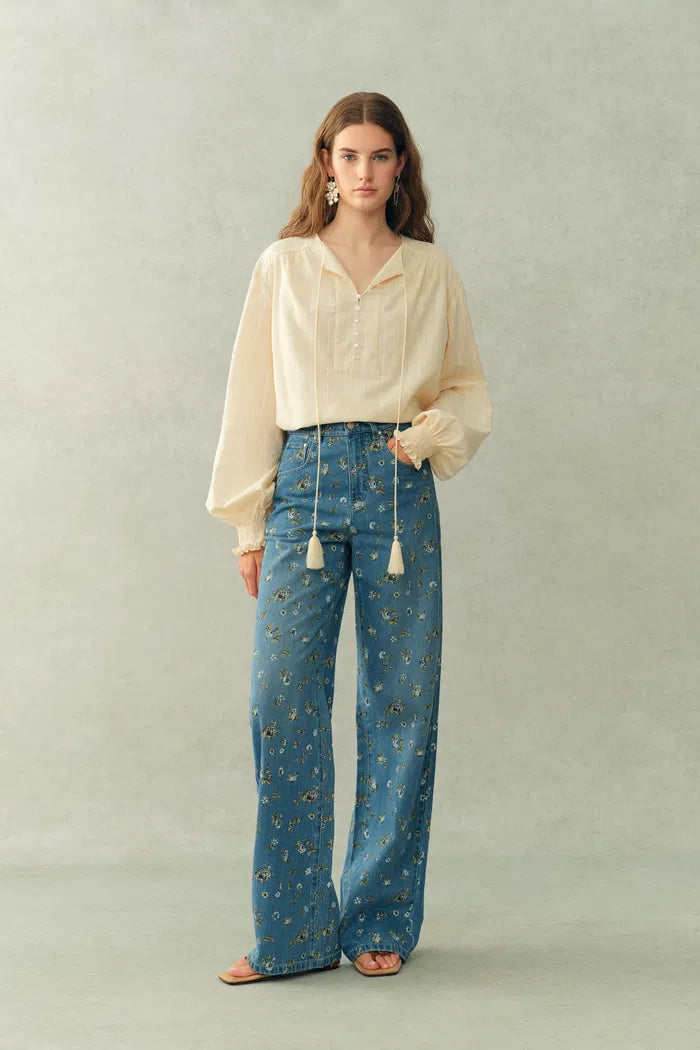 Eine klassische Hemdensilhouette, die durch die Jacquard-Streifenstruktur interessanter wird. Perlenfransen-Bänder setzen einen kleinen Bewegungspunkt am Ausschnitt, der einfache Styles durchdacht wirken lässt.