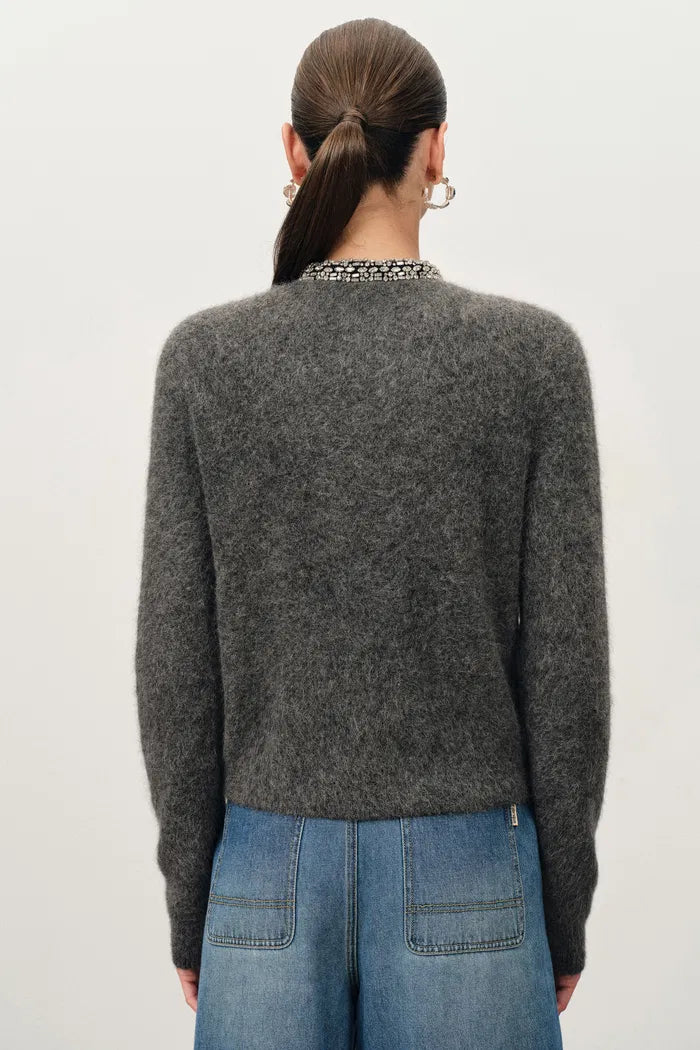 Über 100 K9-Kristalle in Marquise-, Kissen- und Rundschliff erzeugen Sternbild-Effekte am Kragen. Der versteckte Hakenverschluss ist mit Kristalldetails versehen, während die Alpaka-Konstruktion wolkenweichen Komfort bietet, der das Funkeln auch tagsüber tragbar macht.