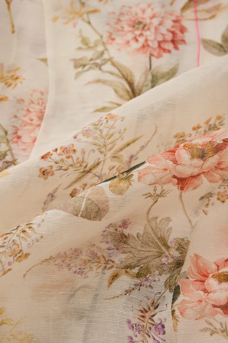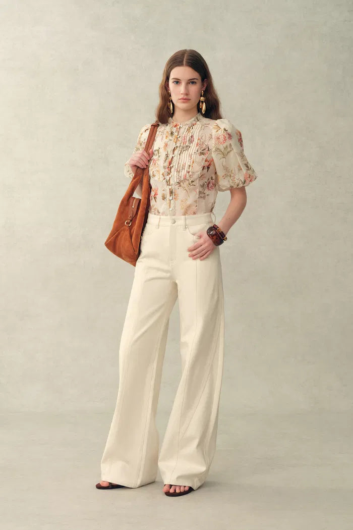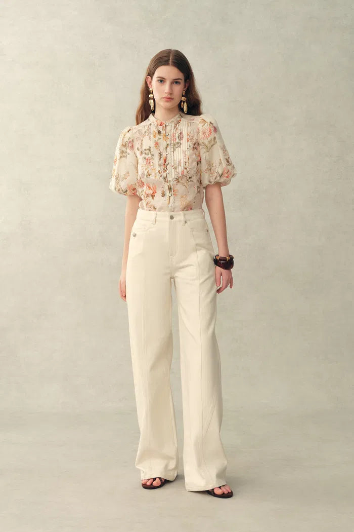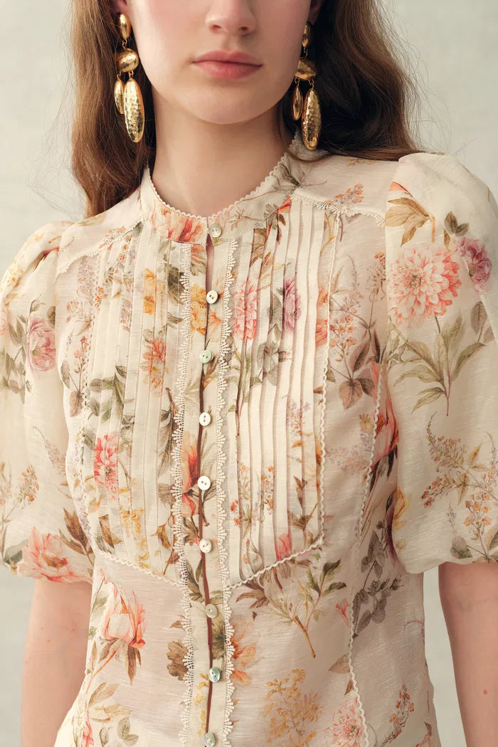 Ein romantisches Update der Sommerbluse, die sich leicht, luftig und sanft detailliert anfühlt. Der gemalte Blumenprint, Puffärmel und der Bindekragen verleihen eine Vintage-Note, während die transparente Seide-Leinen-Mischung sie bei warmem Wetter angenehm macht.