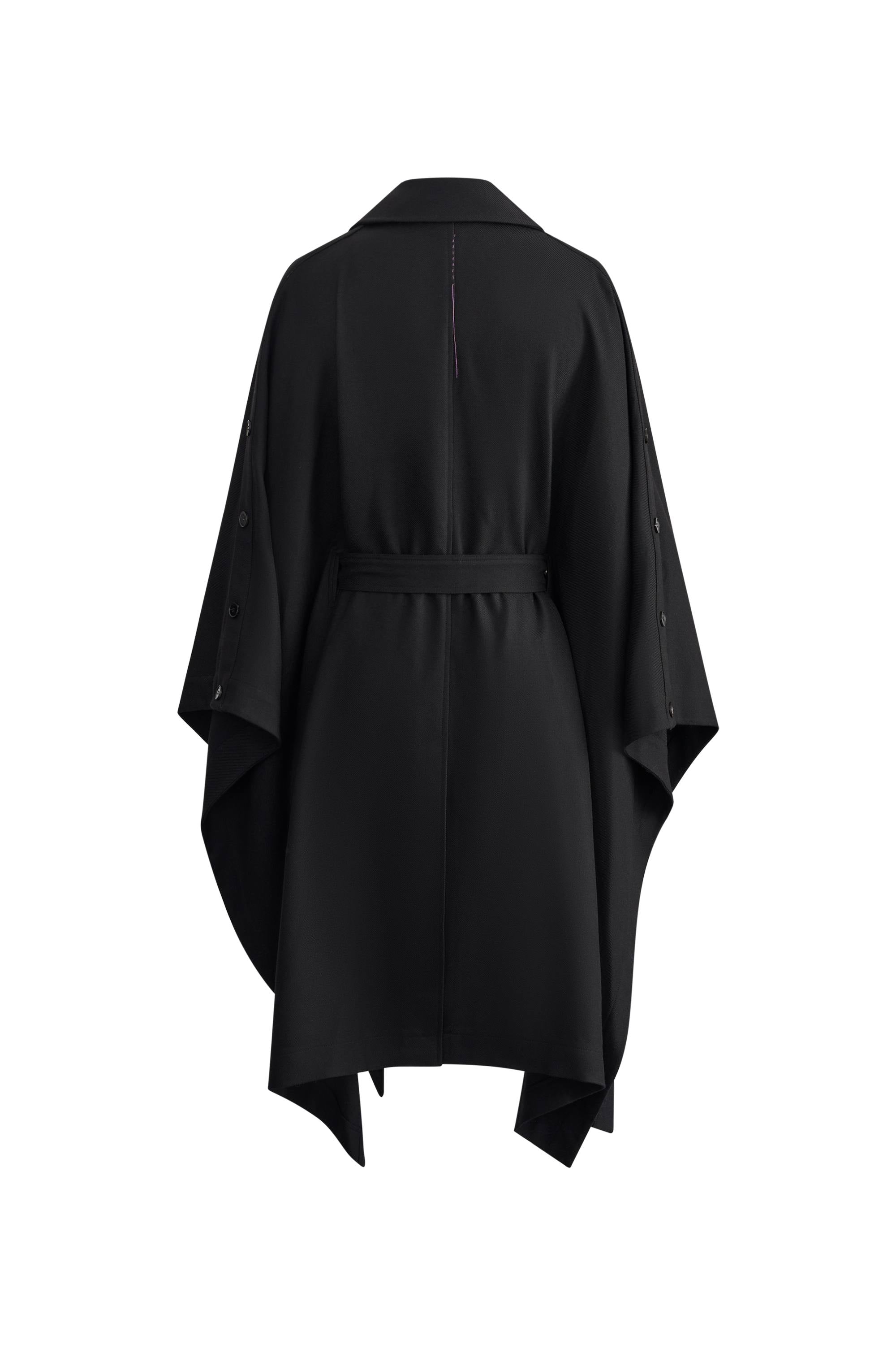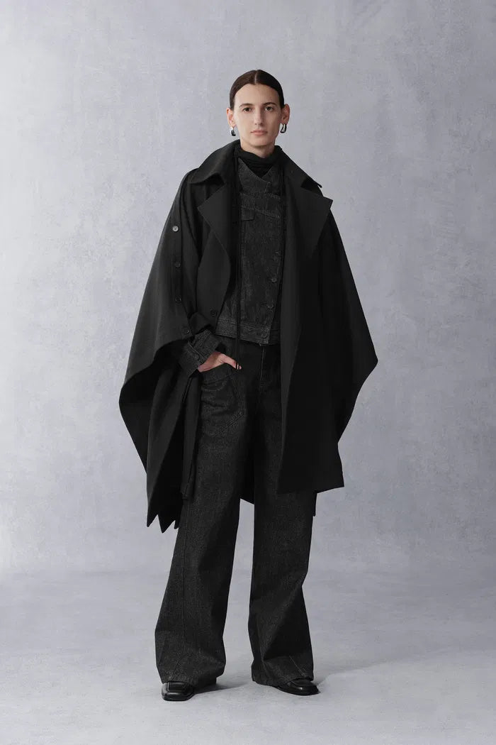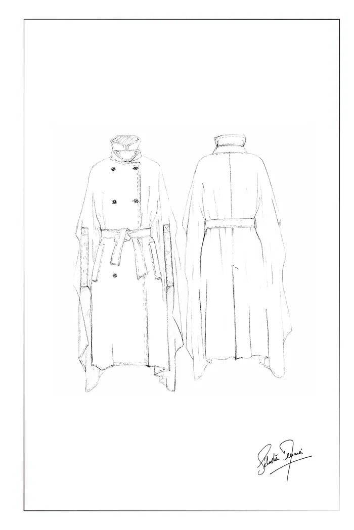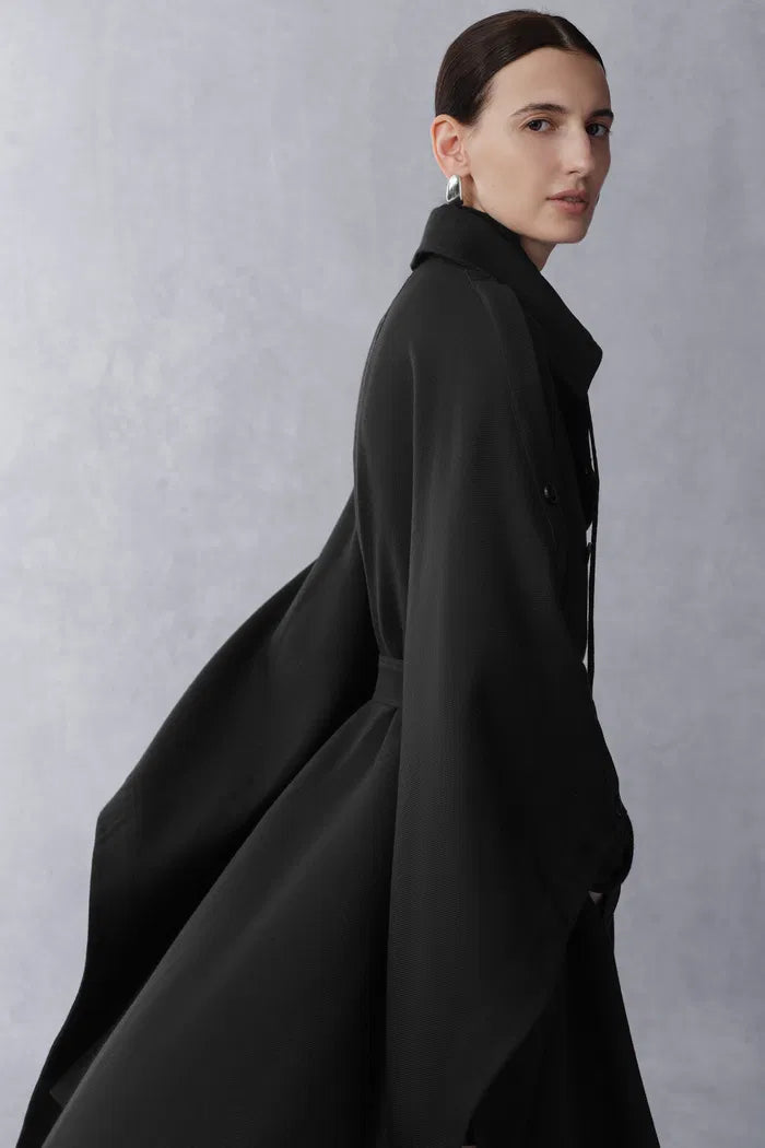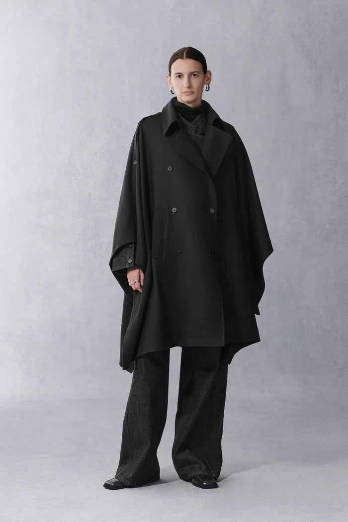 Mittelalterliche Umhangkonstruktion trifft auf doppelreihige Trench-Details in diesem dramatischen Oberbekleidungsstück. Die einteilige Schulterkonstruktion schafft eine fließende Silhouette, während der leichte Stoff urbane Praktikabilität für das moderne Leben gewährleistet.