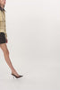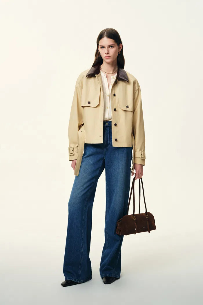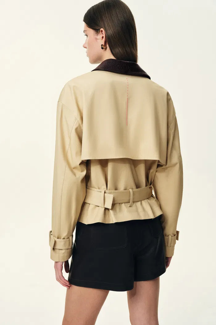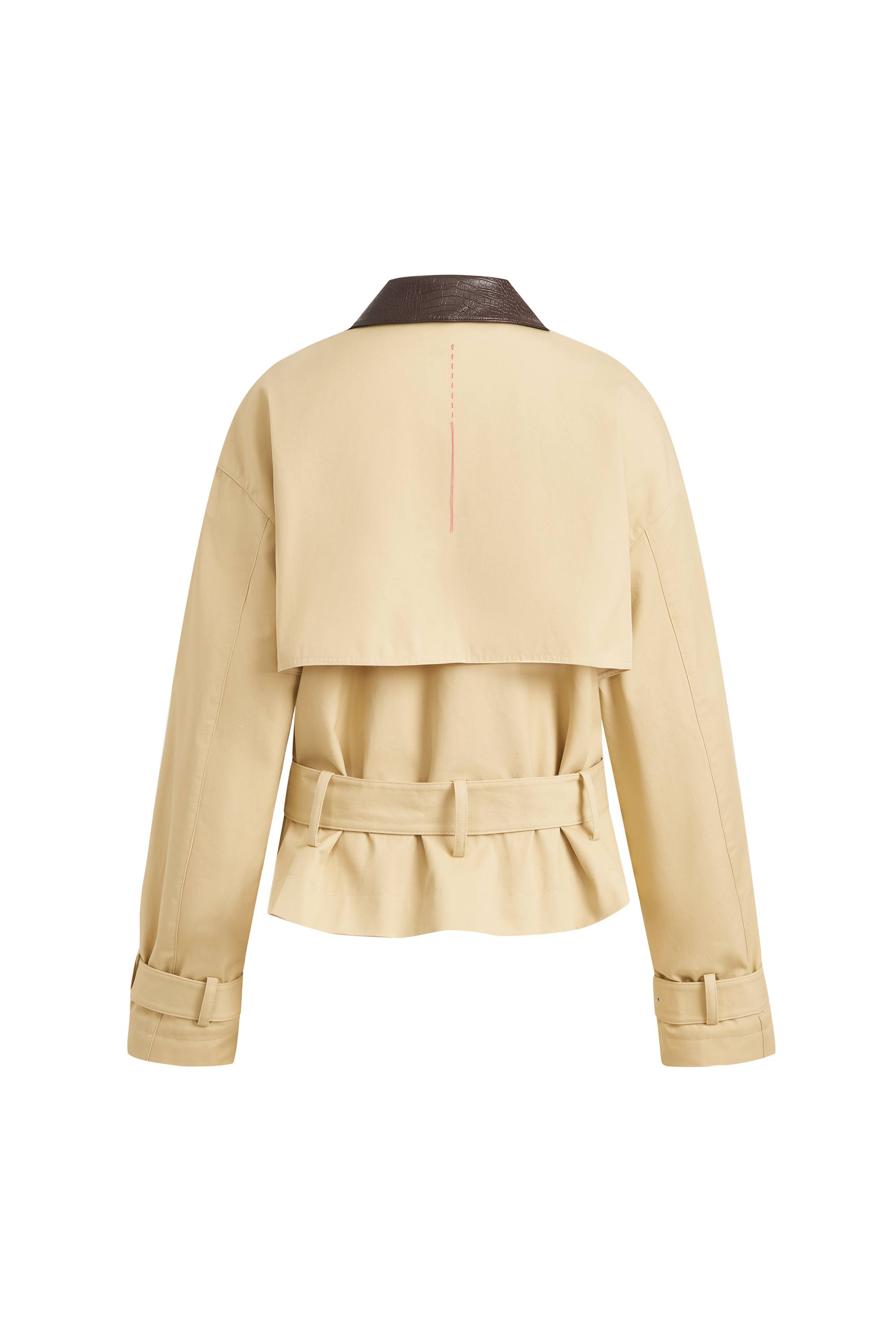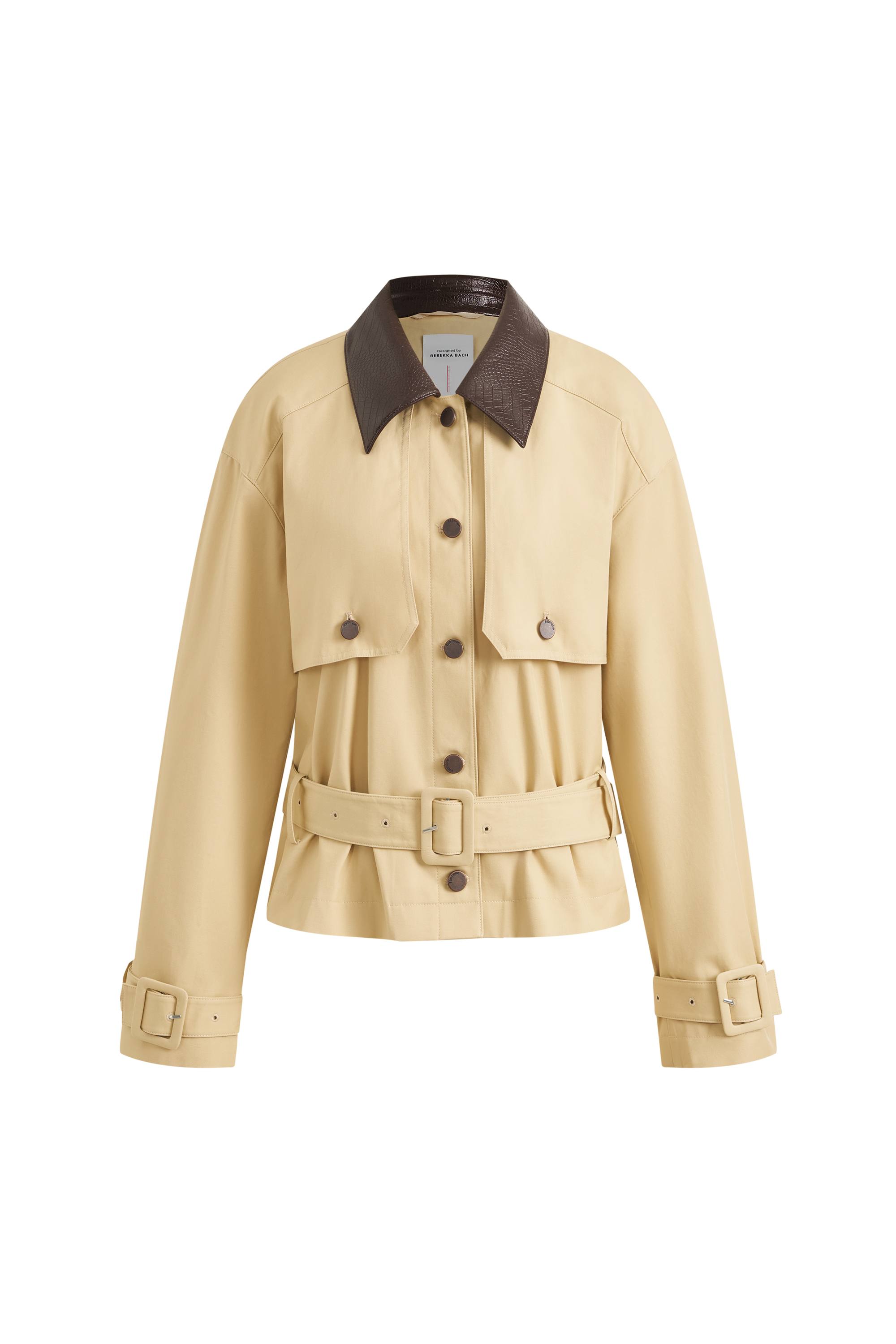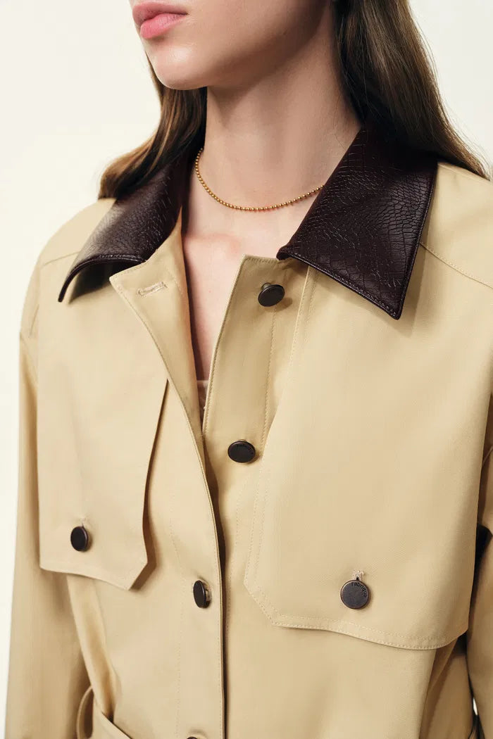 Eine leichte khakifarbene Baumwolljacke, die locker am Körper sitzt und mit Gürtel bei Bedarf tailliert werden kann. Der abnehmbare Lederkragen verleiht ihr zwei Stimmungen: klar und minimalistisch oder etwas mehr Vintage.