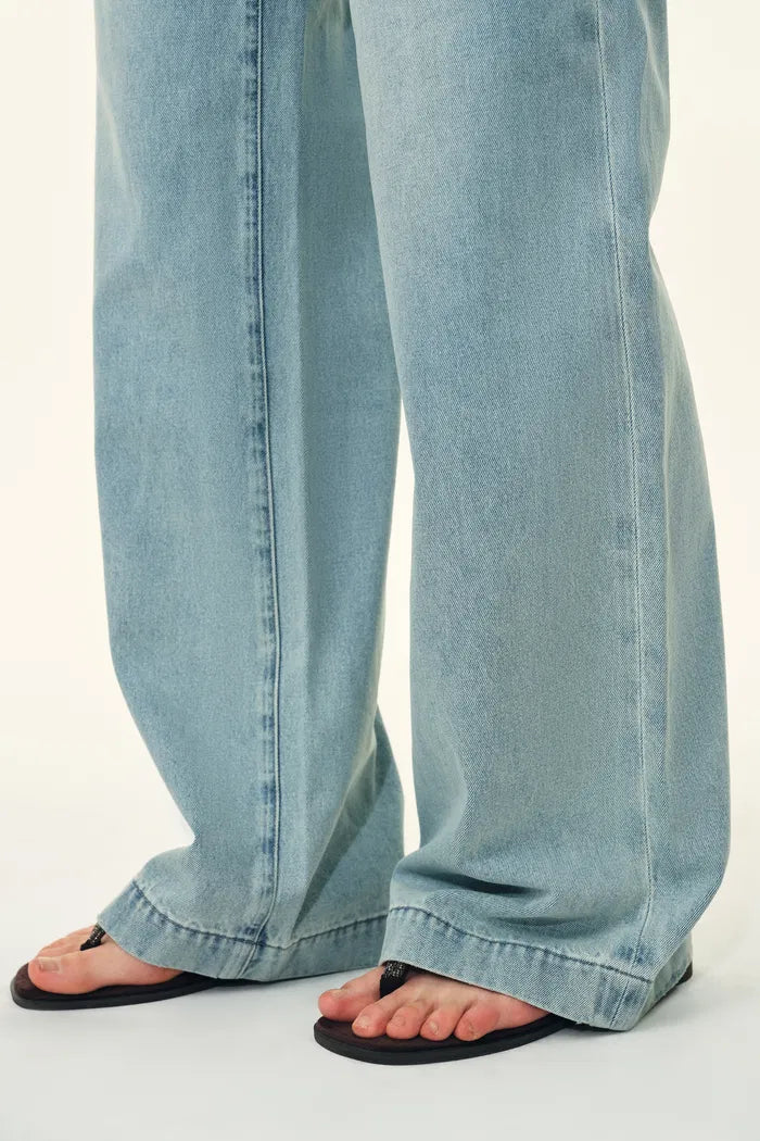 Leichter reiner Baumwoll-DENIM mit weichem Griff und Vintage-Fading. Der blassblaue Ton sorgt für Frische im frühen Frühling.