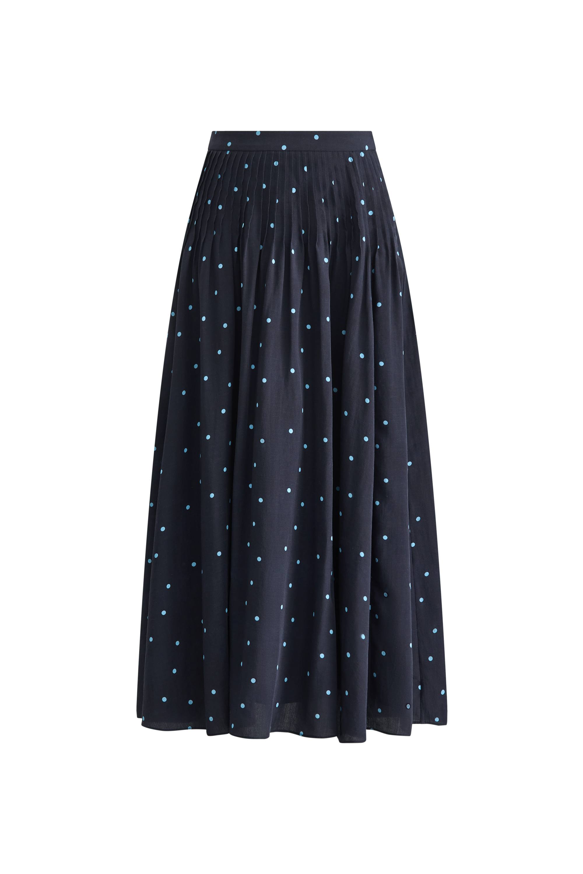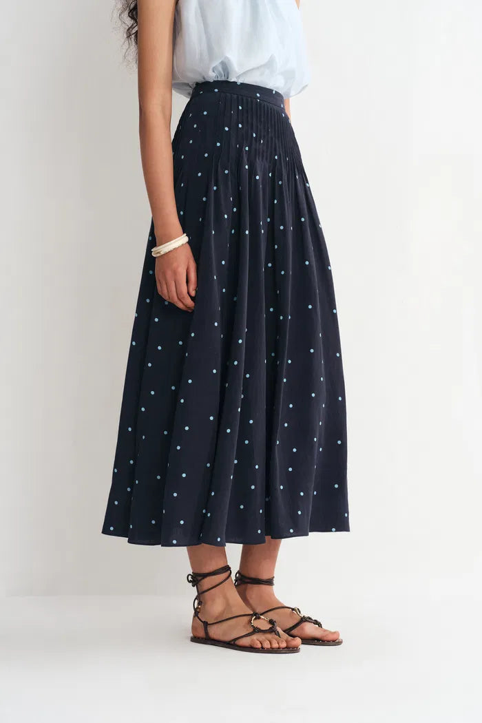 Dieser Nora-Rock kombiniert dichte Kellerfalten mit einem vollen, schwingenden Saum. Navy-Hintergrund mit hellblauen Polka Dots schafft Vintage-Charme mit moderner Proportion. Die Leinenmischung behält ihre Form und bleibt dabei atmungsaktiv – dein neuer Favorit für legere und festliche Anlässe.