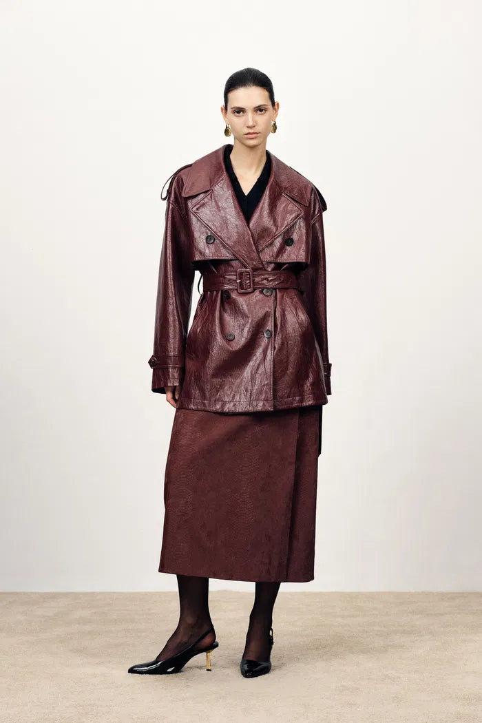 Ein Trench mit Charakter — elegantes, gewachstes Kunstleder in tiefem Bordeaux oder Weinrot bringt das Selbstbewusstsein der 1980er in moderne Form. Der leichte Fall und der subtile Glanz umrahmen die Bewegung wunderschön, während der Gürtel eine klare, gestaltete Silhouette formt, die scharf und zugleich lässig wirkt.