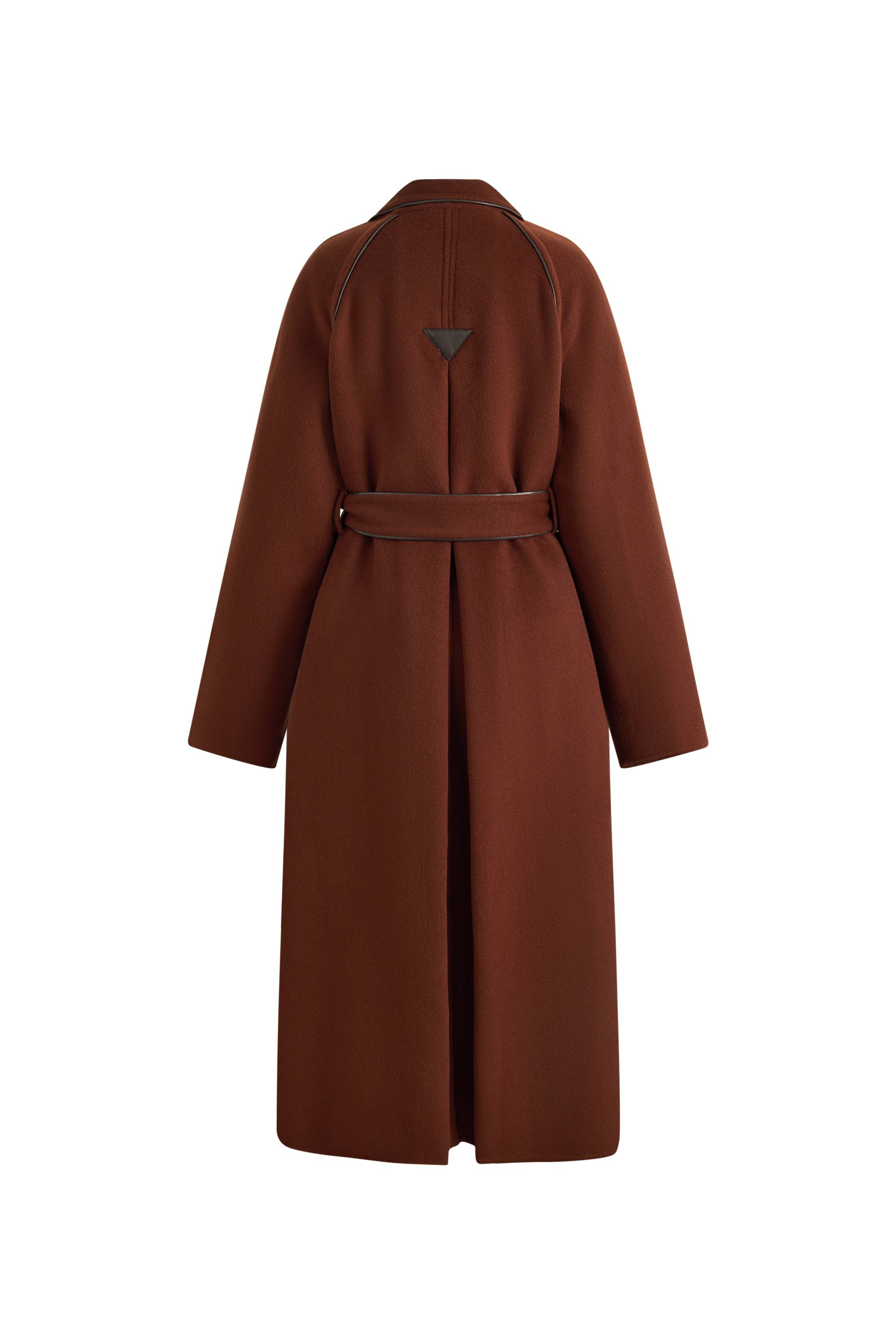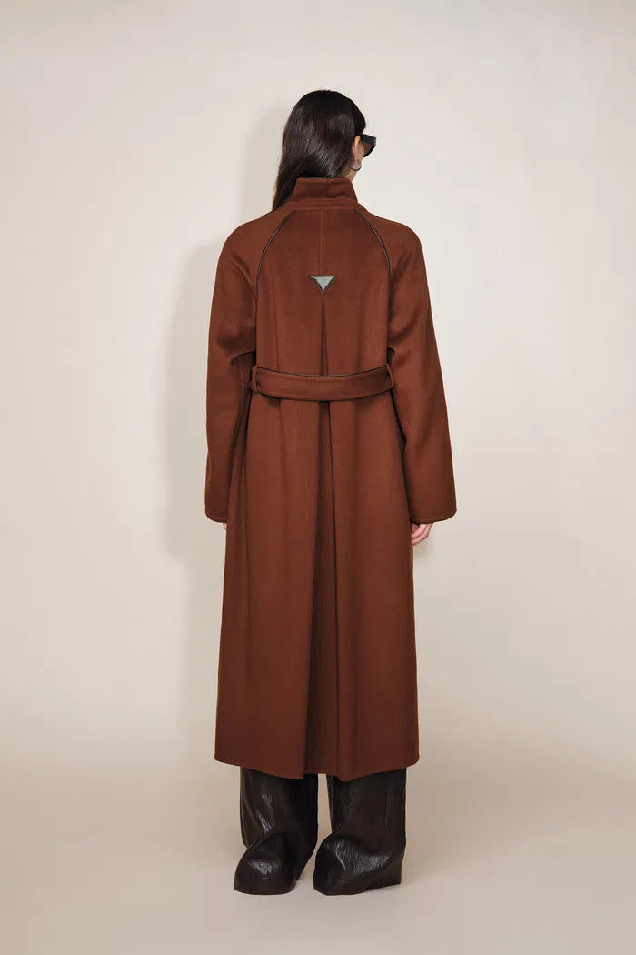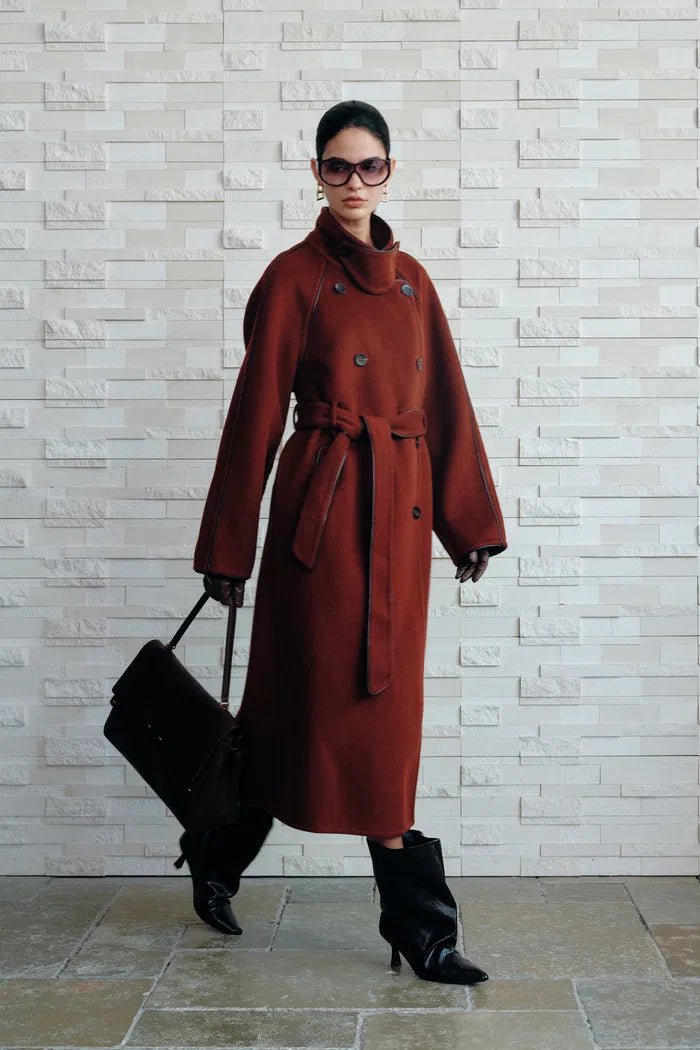 Eine moderne Interpretation des Trenchcoats. Der oversized Wollschnitt bewahrt seine maßgeschneiderte Note, während Lederpaspeln genau die richtige Struktur hinzufügen.