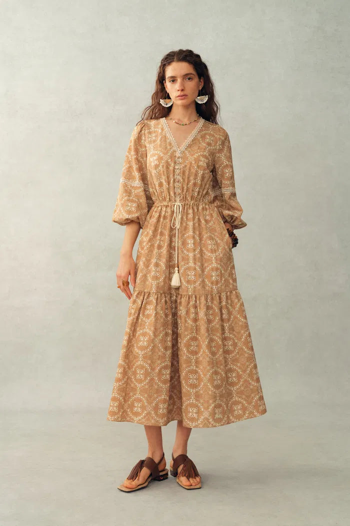 Dieses Maxikleid interpretiert Boho-Motive in einem zarten, leichten Print neu. Die Kaftan-Silhouette wird durch Spitzenbesätze und Quastenbänder aufgewertet und bietet einen entspannten, aber eleganten Look für den ultimativen Urlaub.