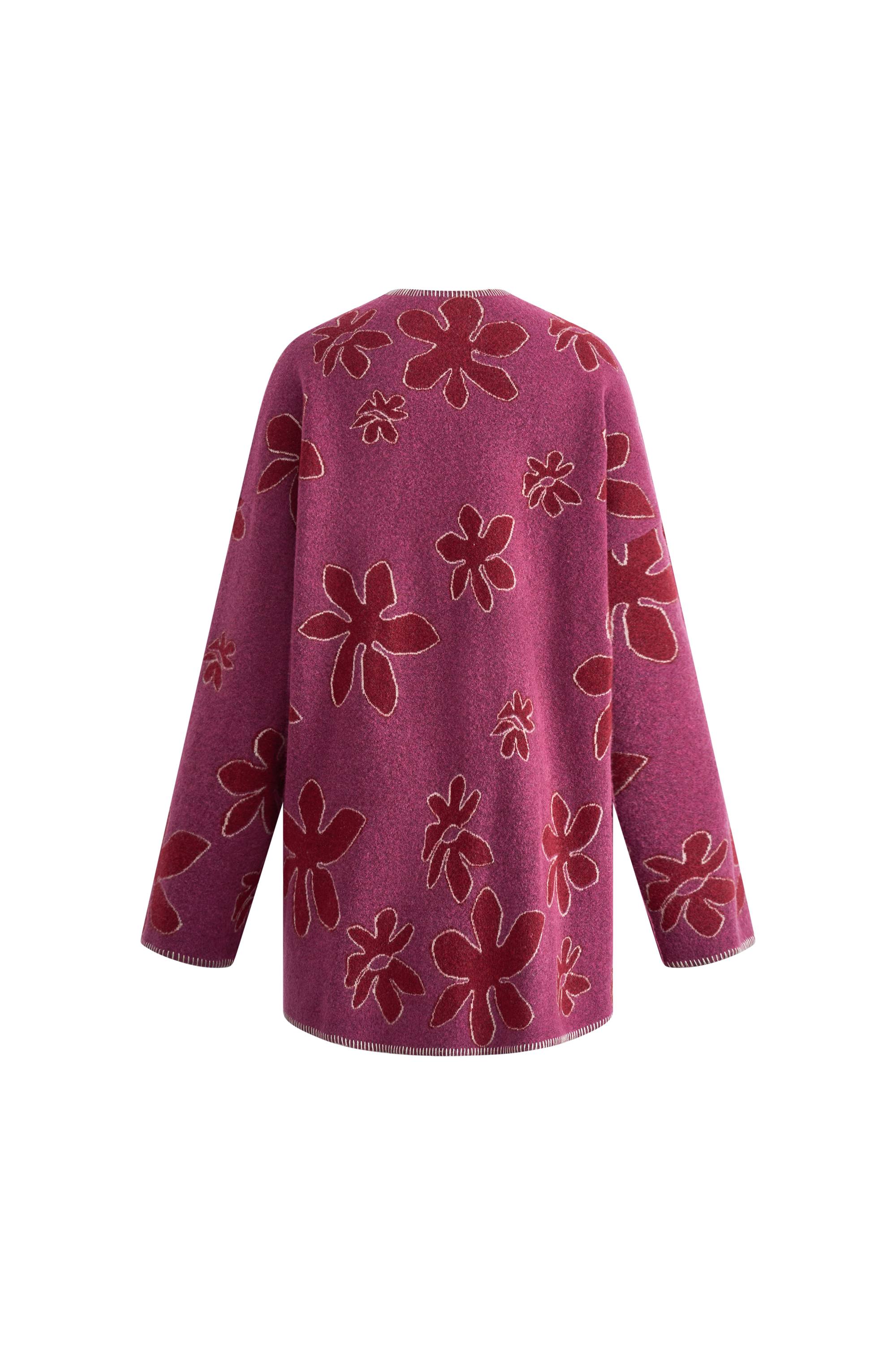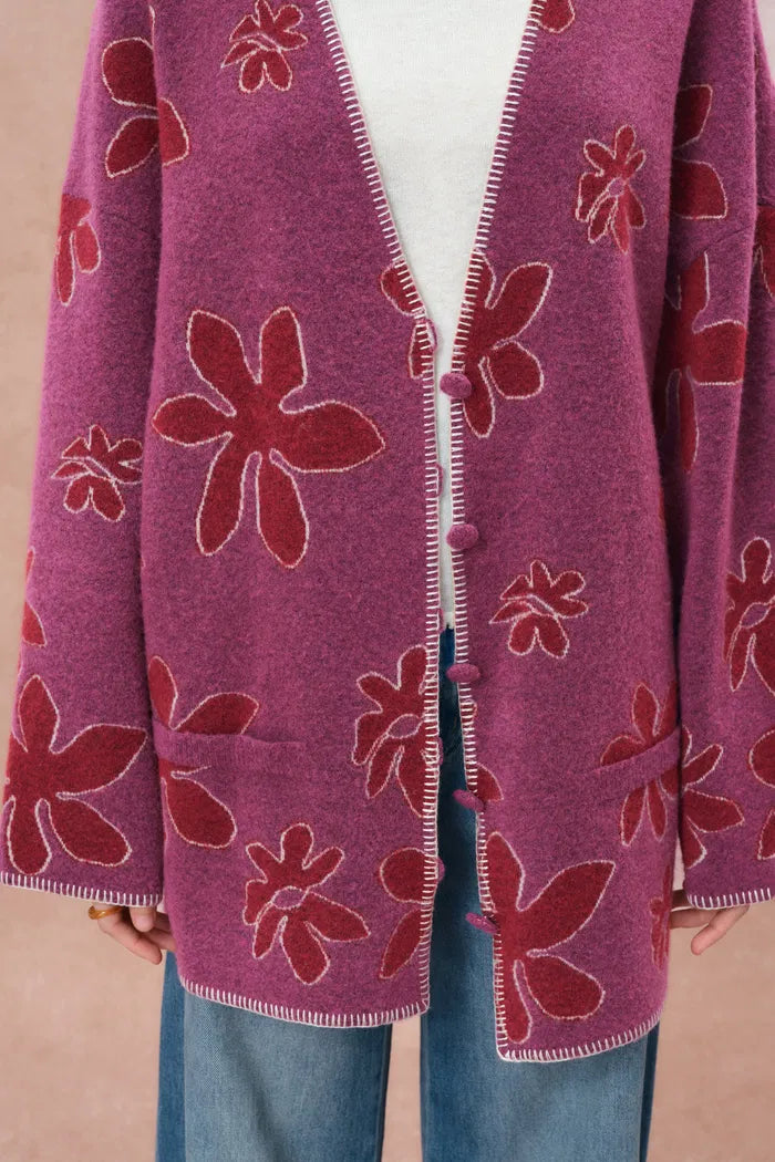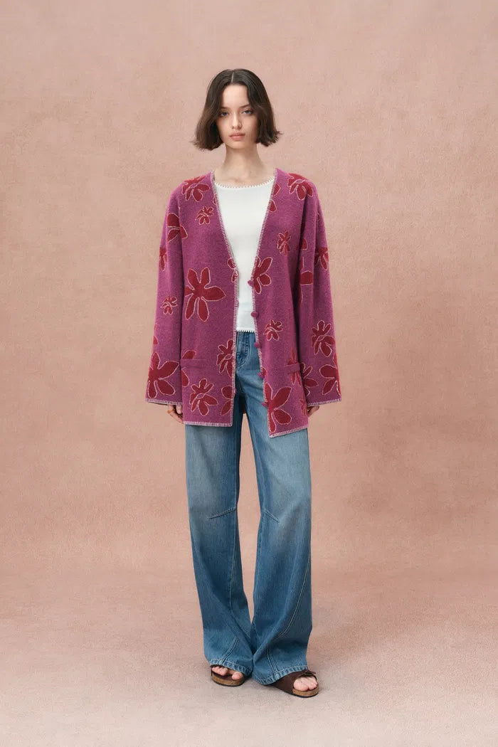 Louloudia Handgehäkelter Rand Floral Jacquard Cardigan aus elastischem Merinowollstrick