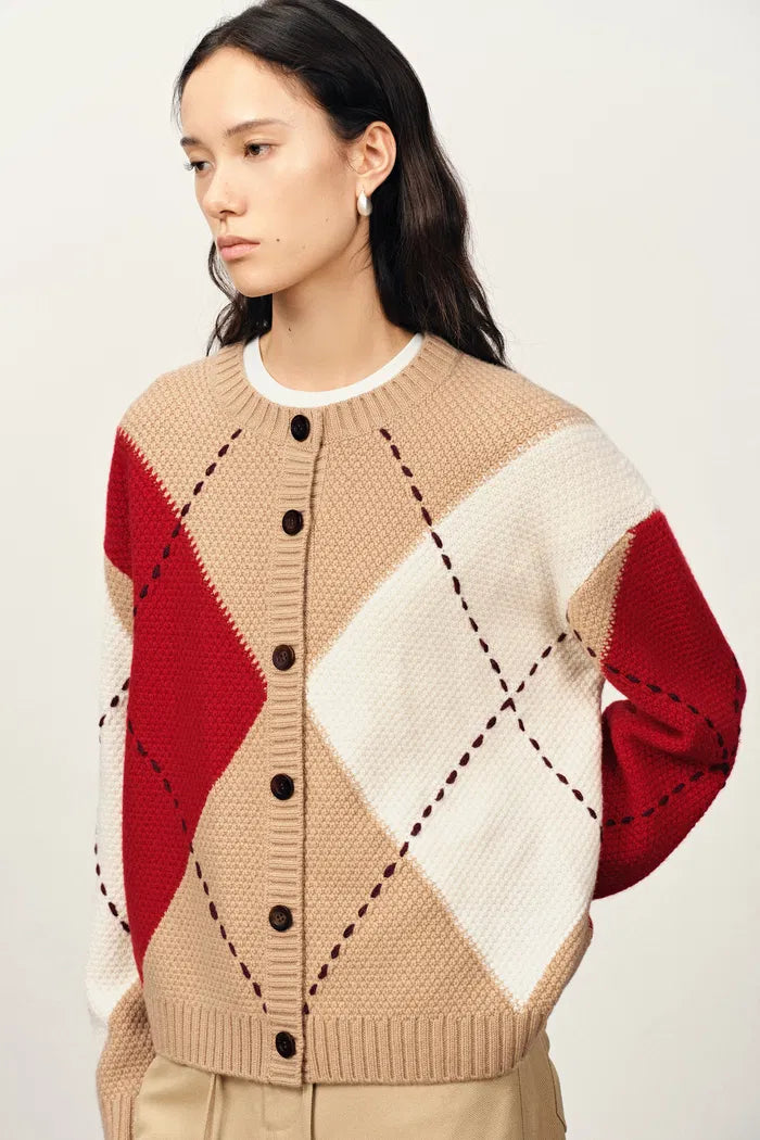 Klassisches Rautenmuster in Creme und Rot wirkt sehr Pariserisch, während die spezielle Strickarbeit raffinierte Details hinzufügt. Passt gut, bietet aber Raum zum Atmen in den langen Wintermonaten.