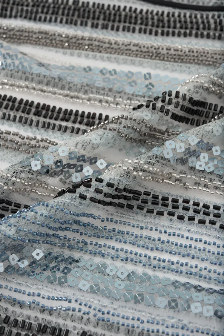 Französisches, perlenbesticktes Mesh mit mehrlagigen, perlenbesetzten Pailletten auf transparentem Grund, strukturiert für leichtes, flexibles Layering. Lockere gerade Schnittführung und präzise abgerundete Kanten ergeben eine tragbare Interpretation der Haute-Couture-Ästhetik.