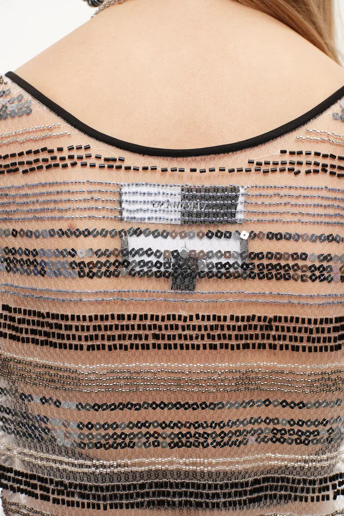 Mit seinem perlenbesetzten Mesh, der lockeren Silhouette und der Stimmung der 1920er Jahre fühlt sich dieses Kleid wie gemacht für Bewegung nach Einbruch der Dunkelheit an. Die Mischung aus silbernen Pailletten, dunklen Perlen und verstreuten goldenen Akzenten verleiht ihm die Art von Details, die beim Tragen lebendig werden.