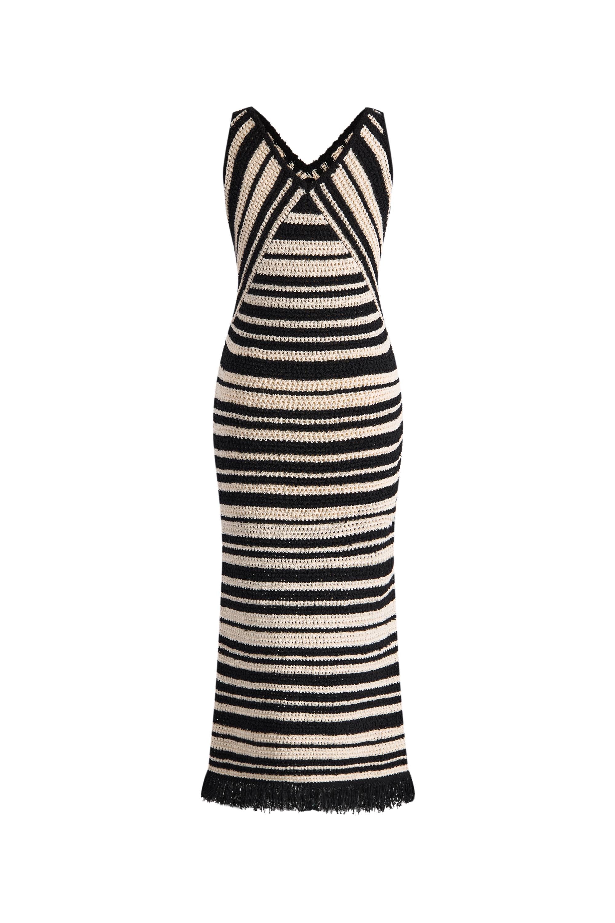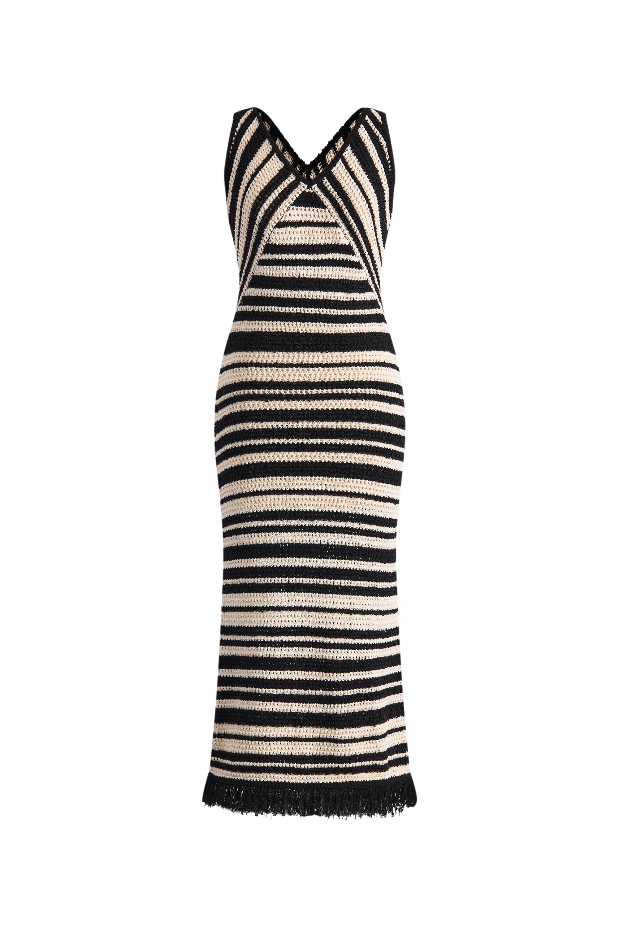 A dress that captures summer's spirit. Black and slightly yellowish white stripes take inspiration from vintage beach umbrellas, while unique knit textures create subtle movement. The handmade tassels add just enough seaside charm.