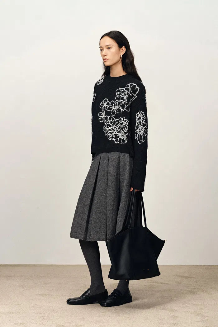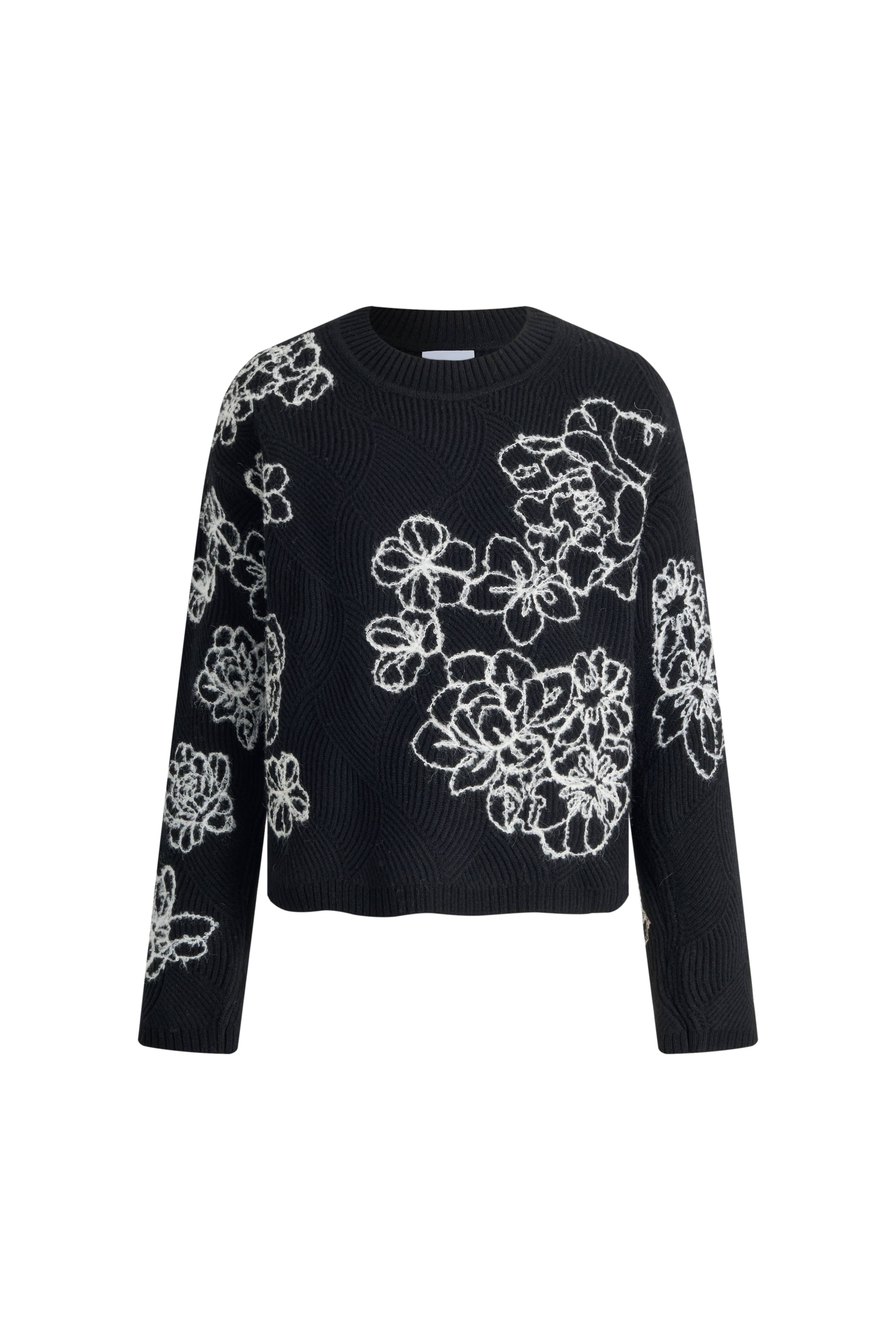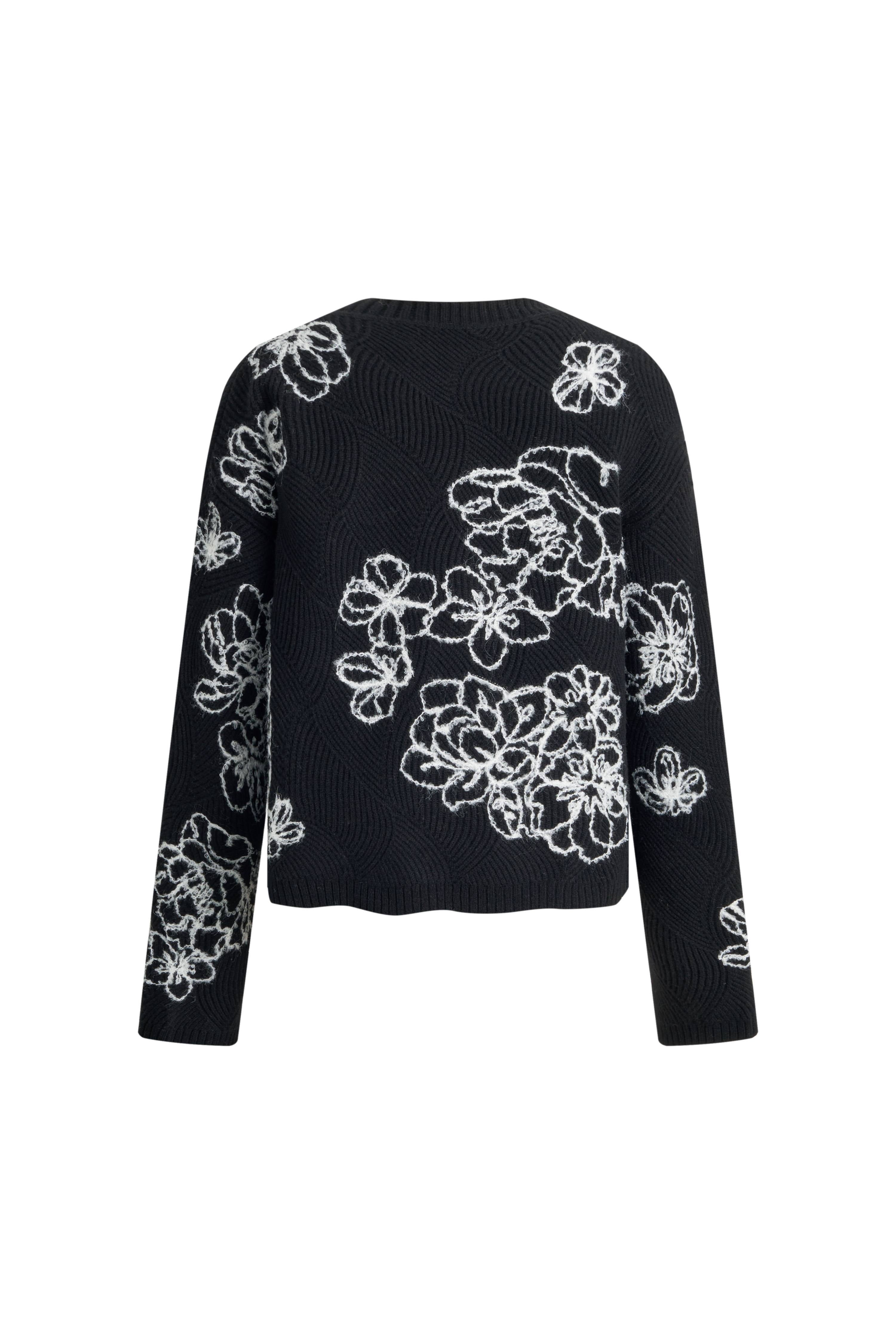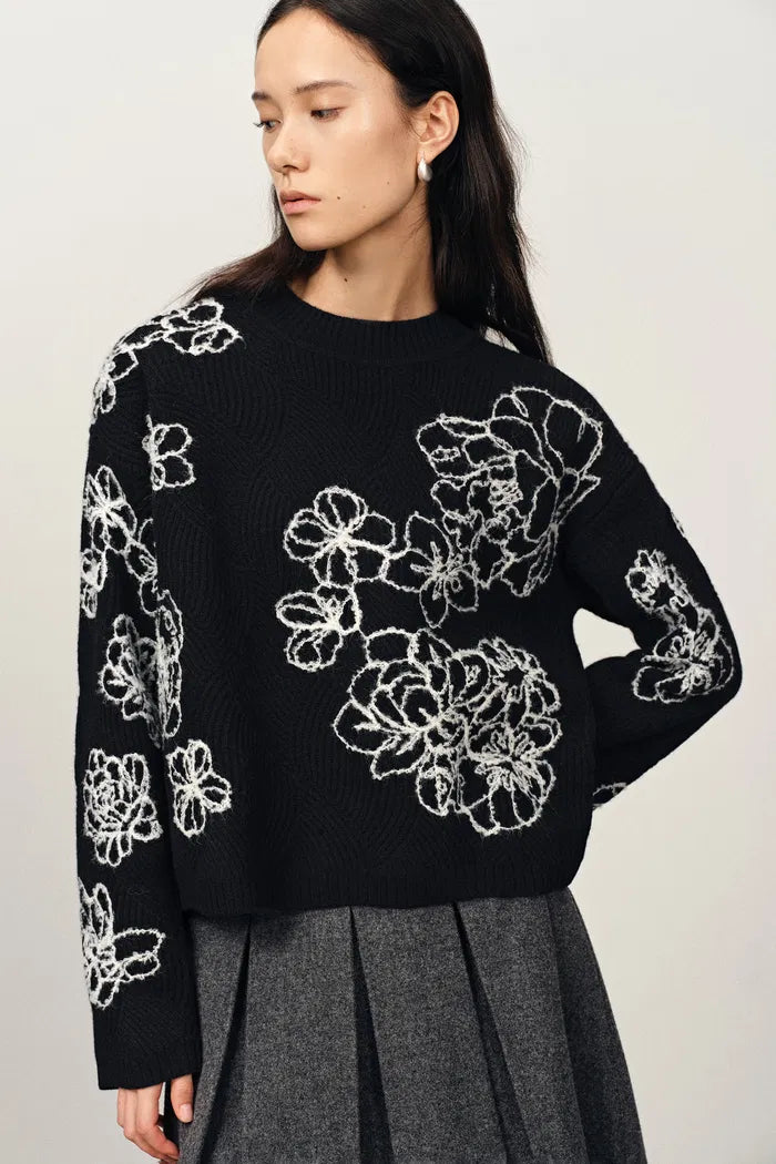 Australian Merino wool from ideal climate and pastures. Fine fibers feel soft and nurturing against skin with breathable warmth and excellent shape retention. Classic black contrasts with pure white loop yarn embroidery for floral poetry. Soft, contrasting, poetic.