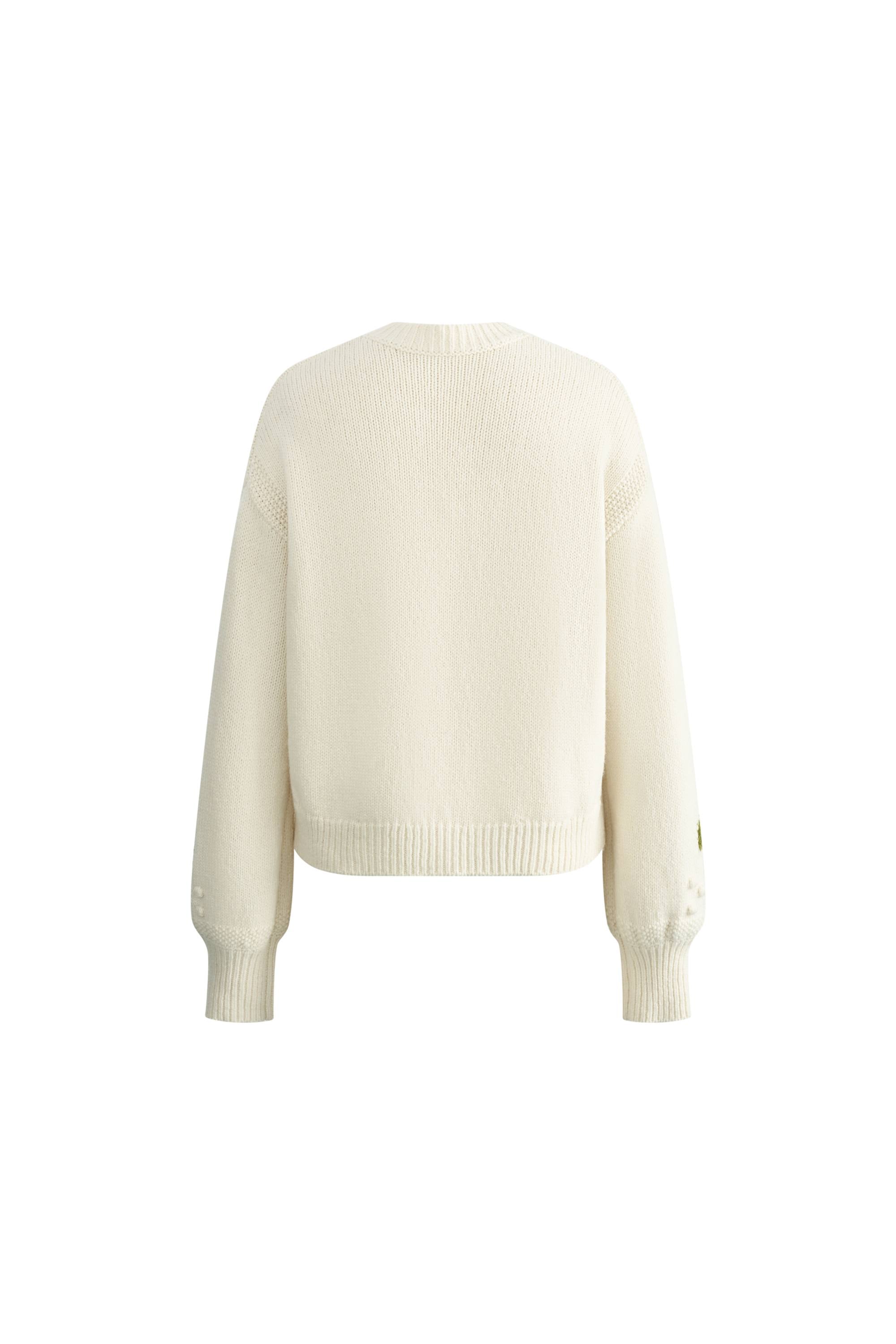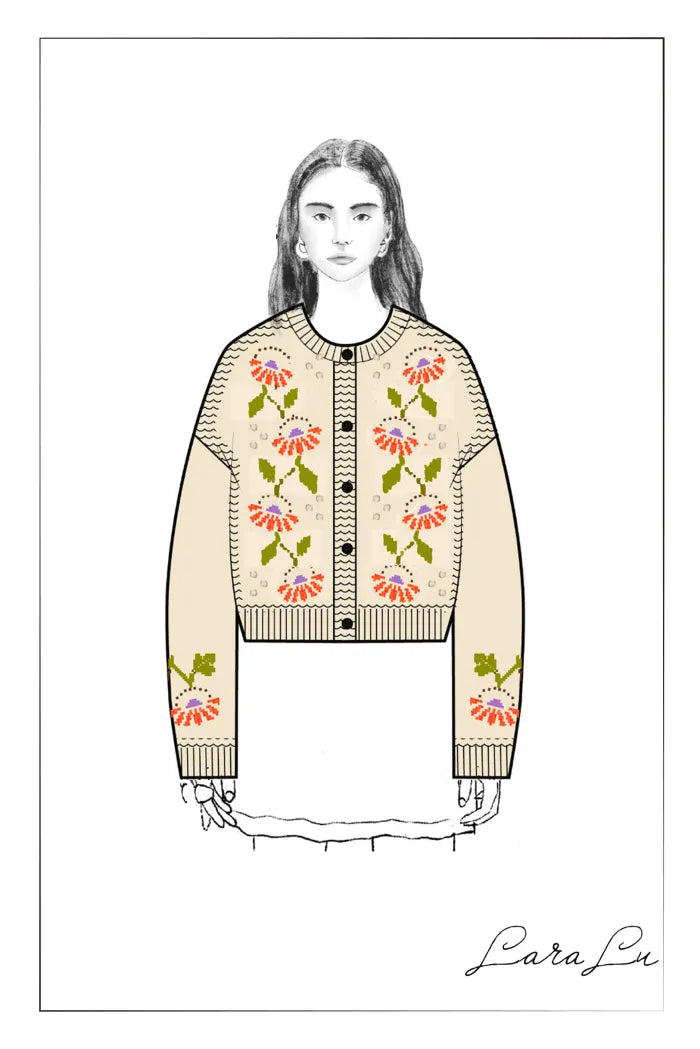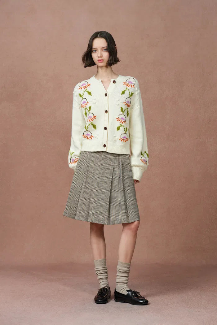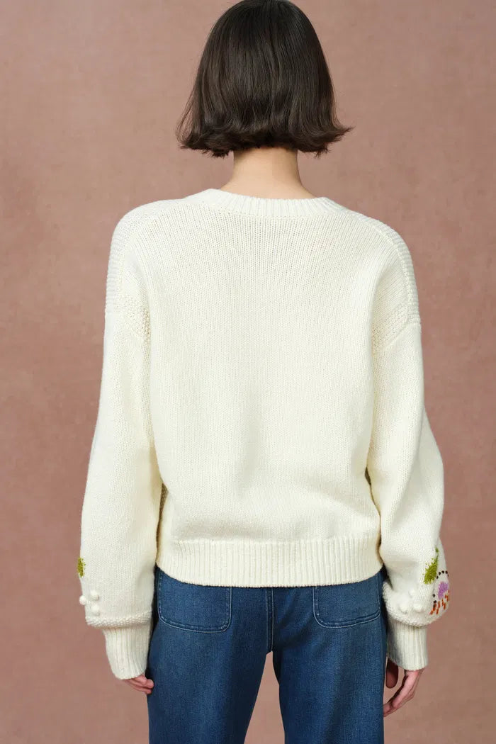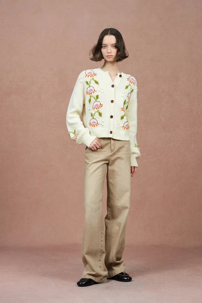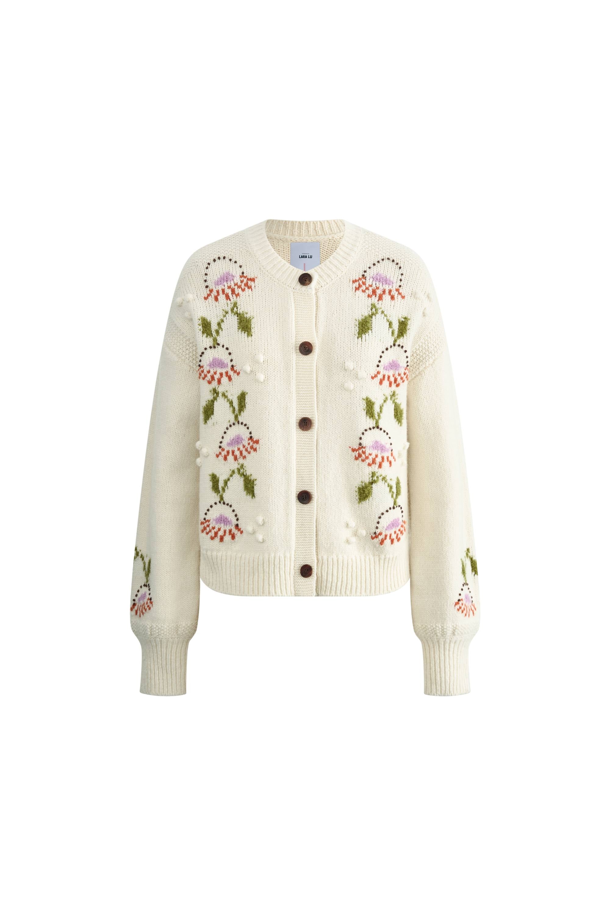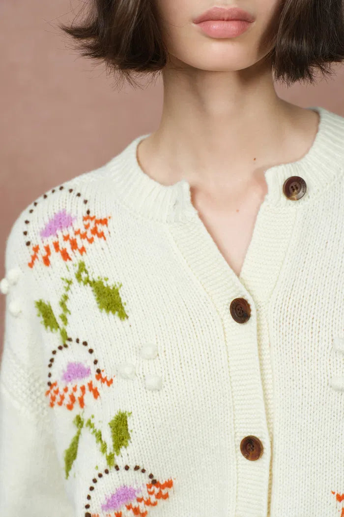 Pine cone flower embroidery creates botanical interest while pineapple shoulder texture adds structured dimension. Hand-crocheted details and tiny pompoms bring whimsical craftsmanship to classic cardigan construction.