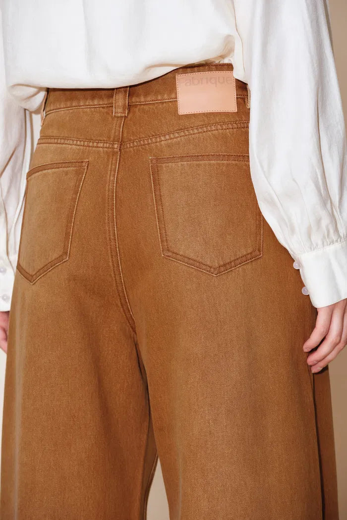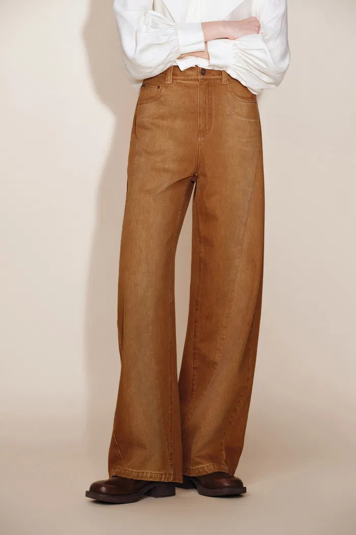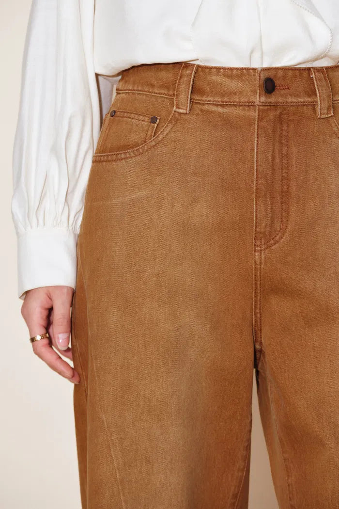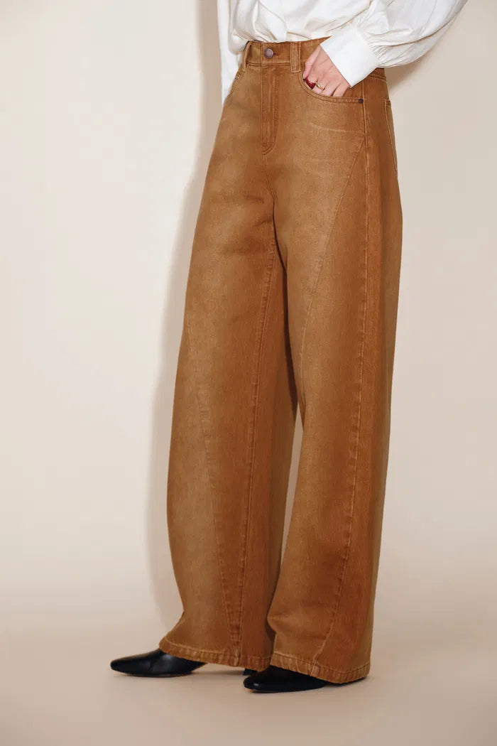 Front panel construction creates the visual interest found in well-designed barrel-leg jeans. Honey brown wash with darker side panels naturally slims while relaxed fit accommodates. Shield pockets reference authentic workwear details.