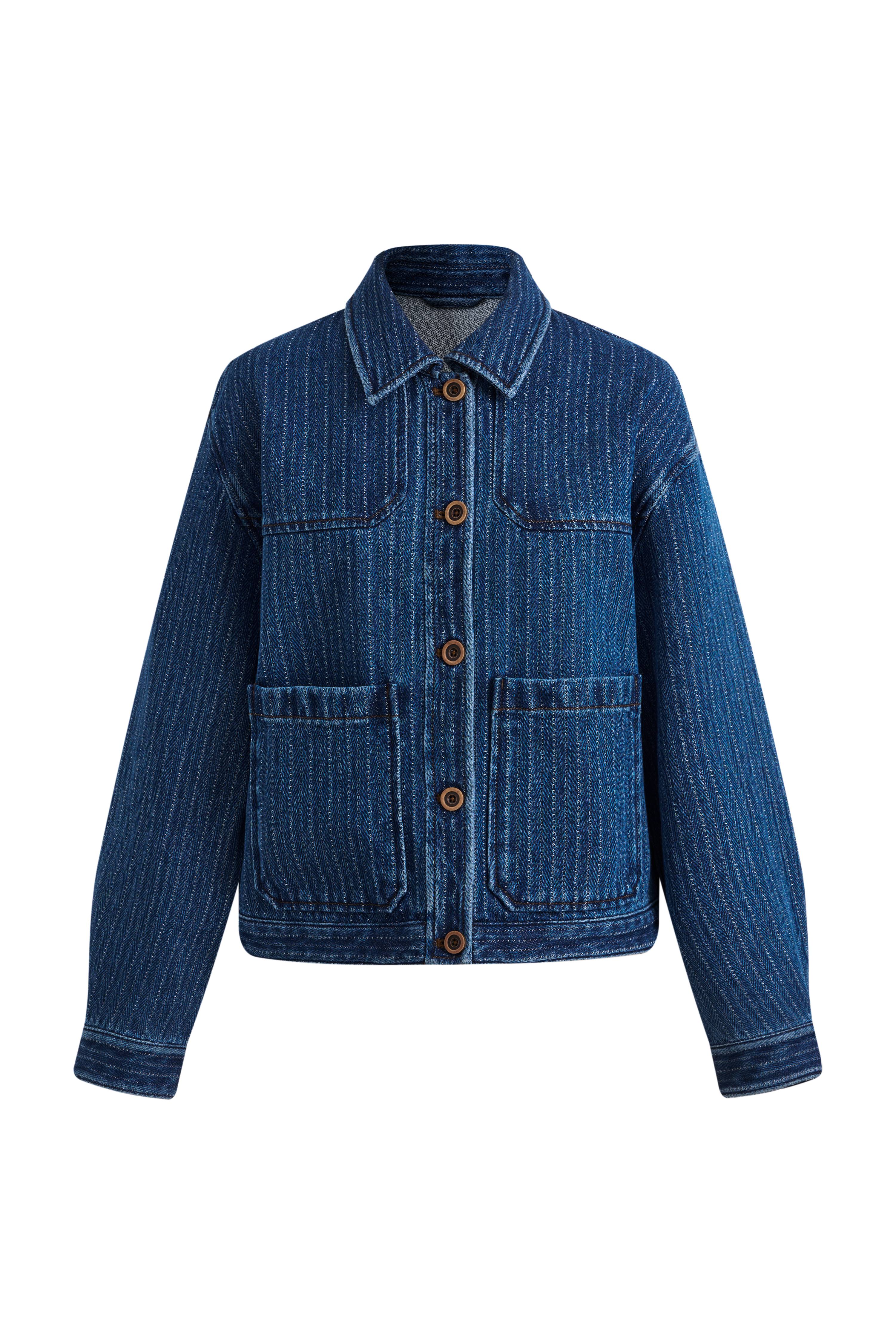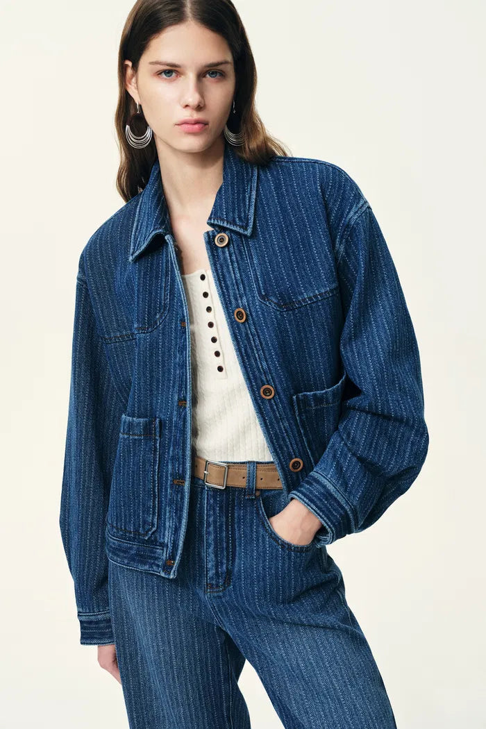 Colette Striped Washed Blue Patch Pocket Jacket in Herringbone Denim