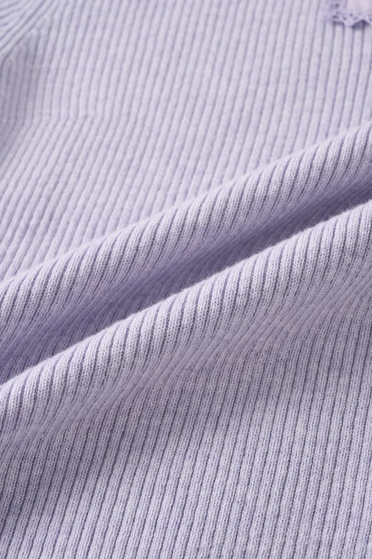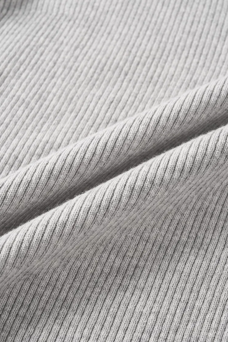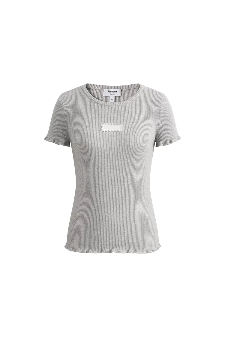 This grey knit top blends cotton and wool for breathable, skin-friendly comfort. The soft elastic knit, wave curling details, and custom lace logo add a playful touch that works across seasons.