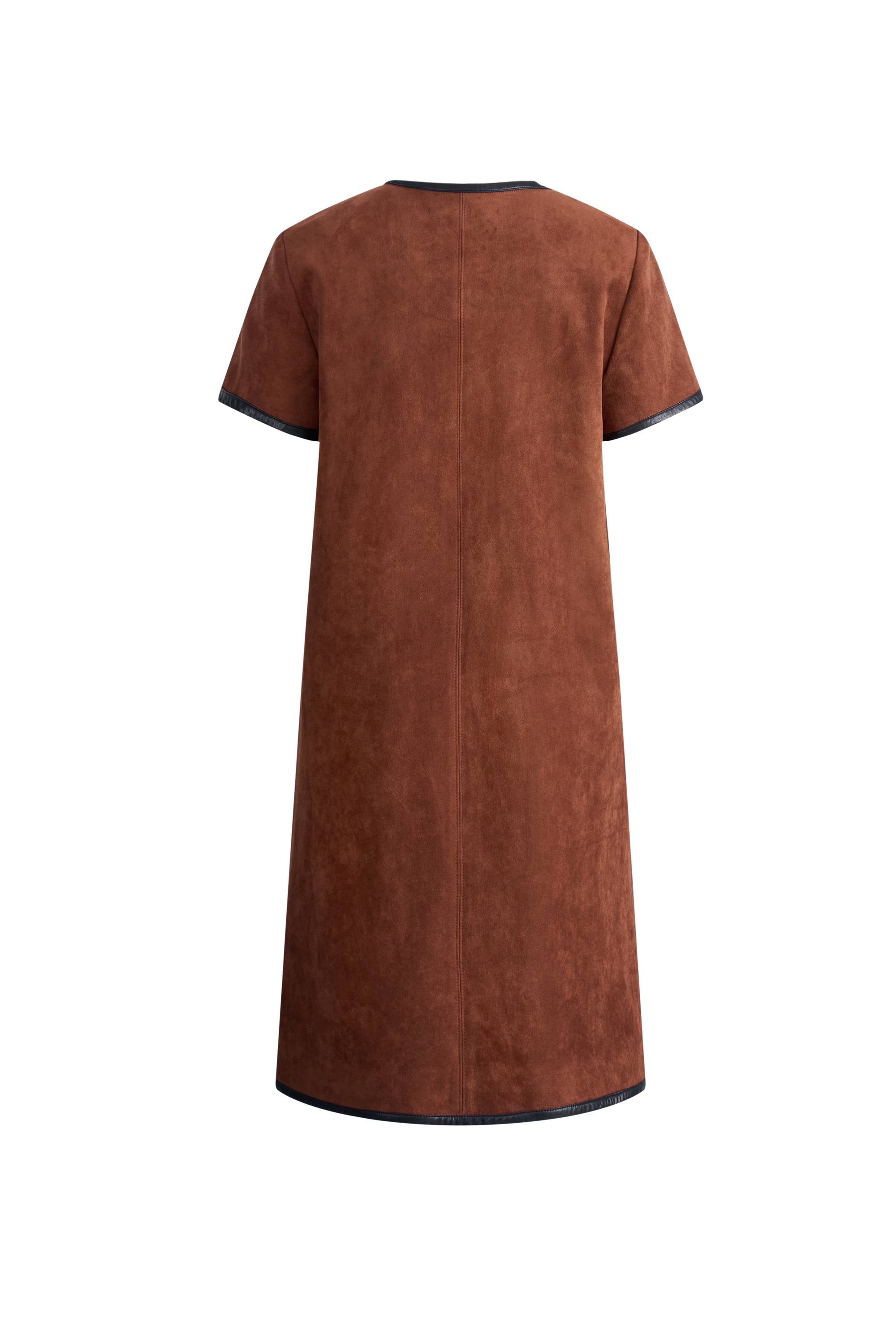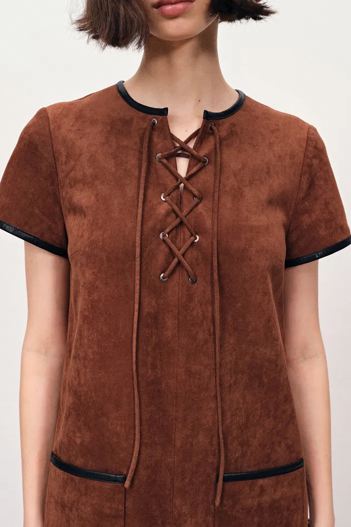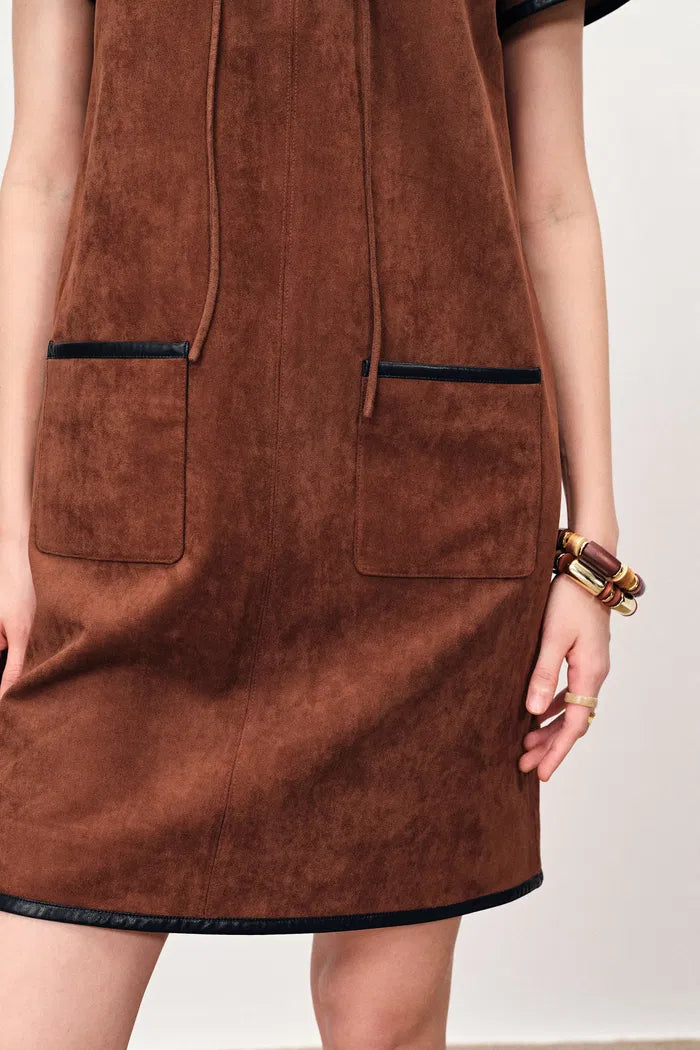 Nevaeh Hand Applied Contrast Leather Trim Short Dress in Ultrasuede