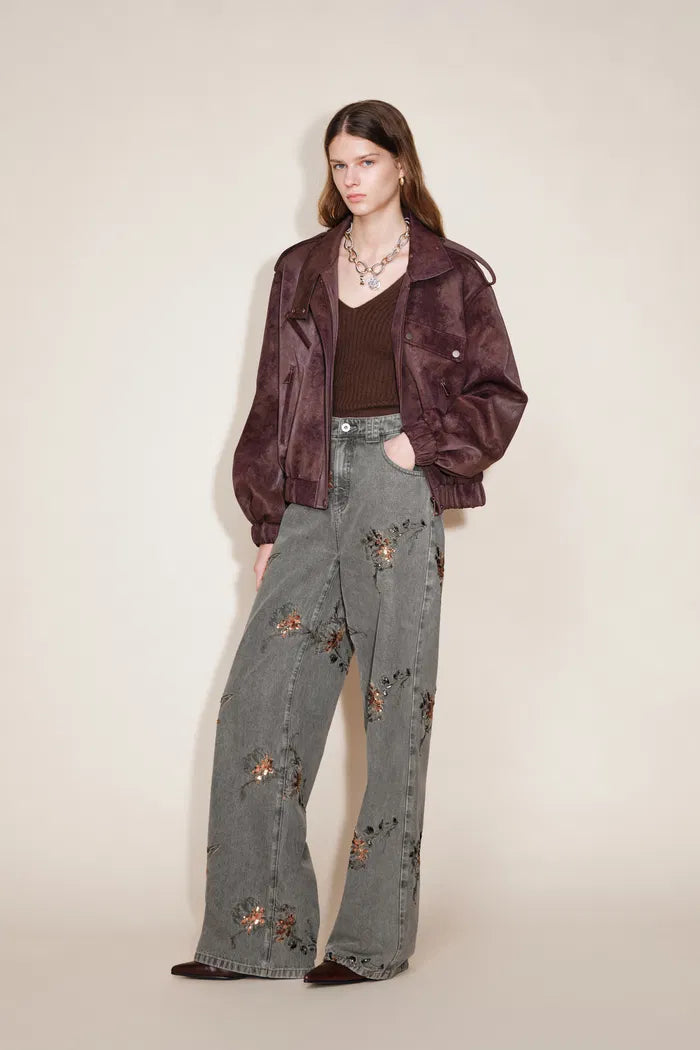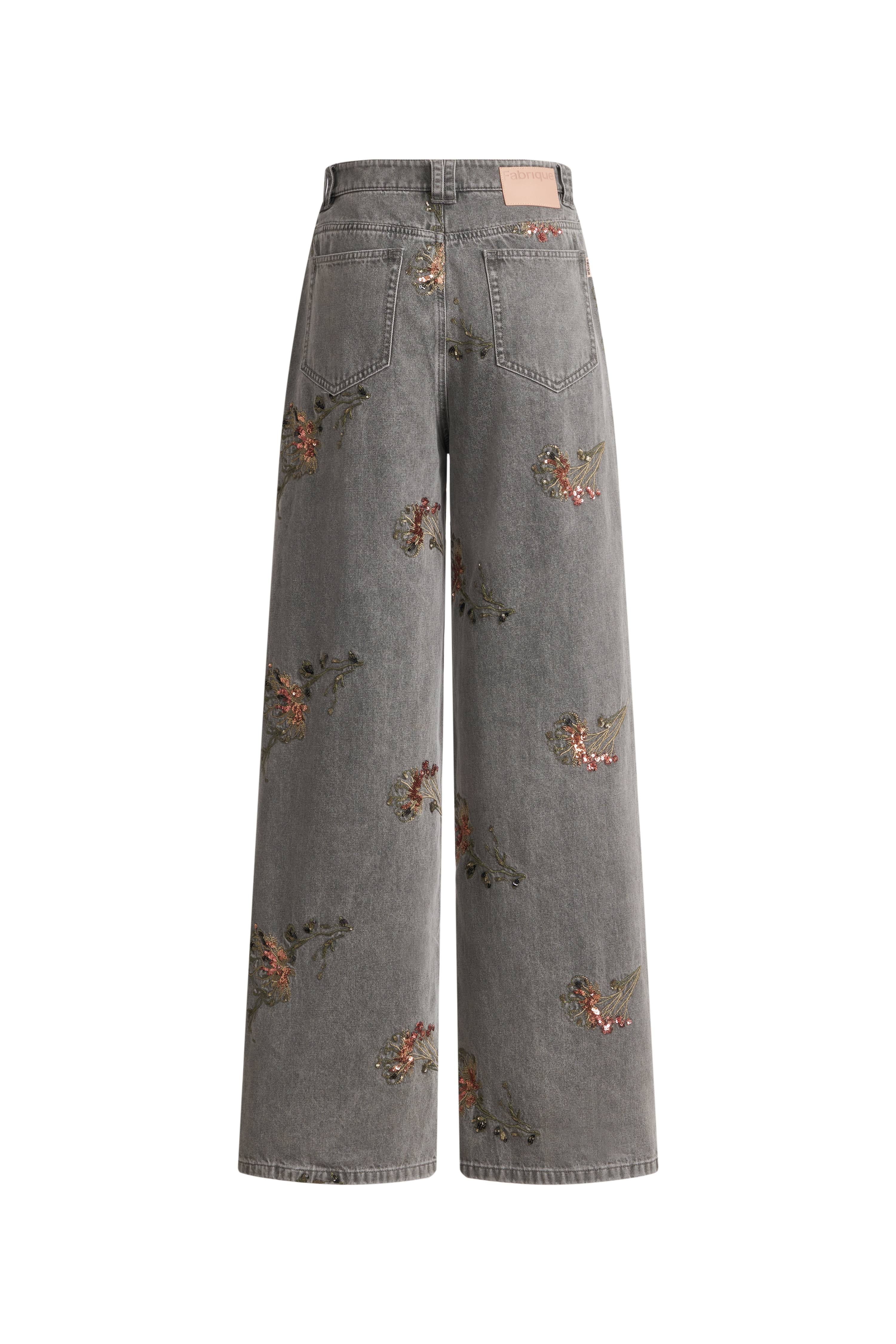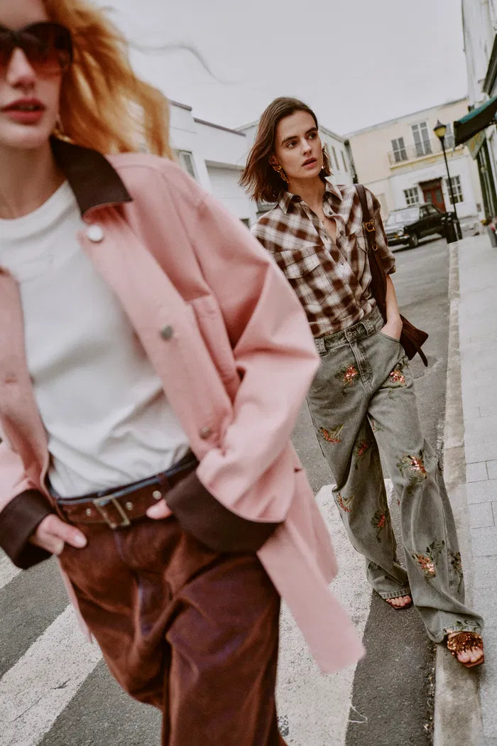 Cotton denim base with custom French bead embroidery, then water-washed for a lived-in softness. Multiple finishing steps create artistic edge while keeping the fabric light and comfortable against skin.