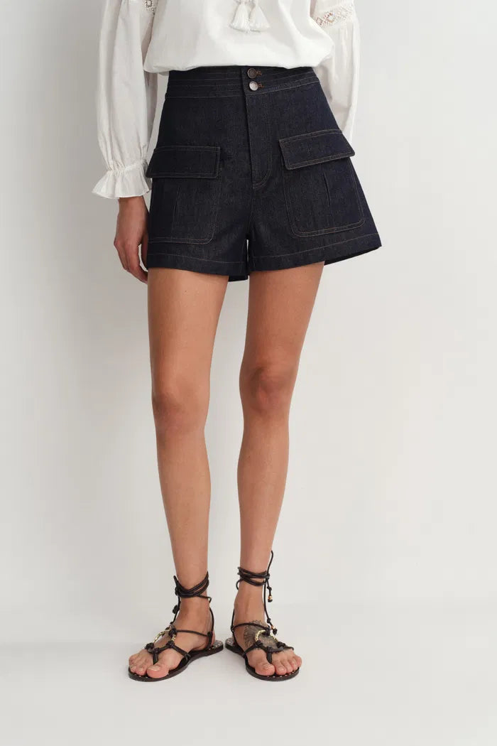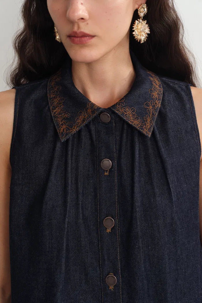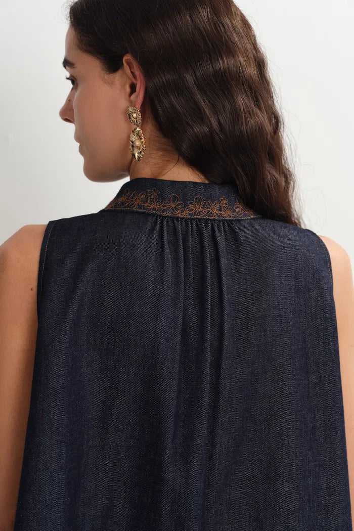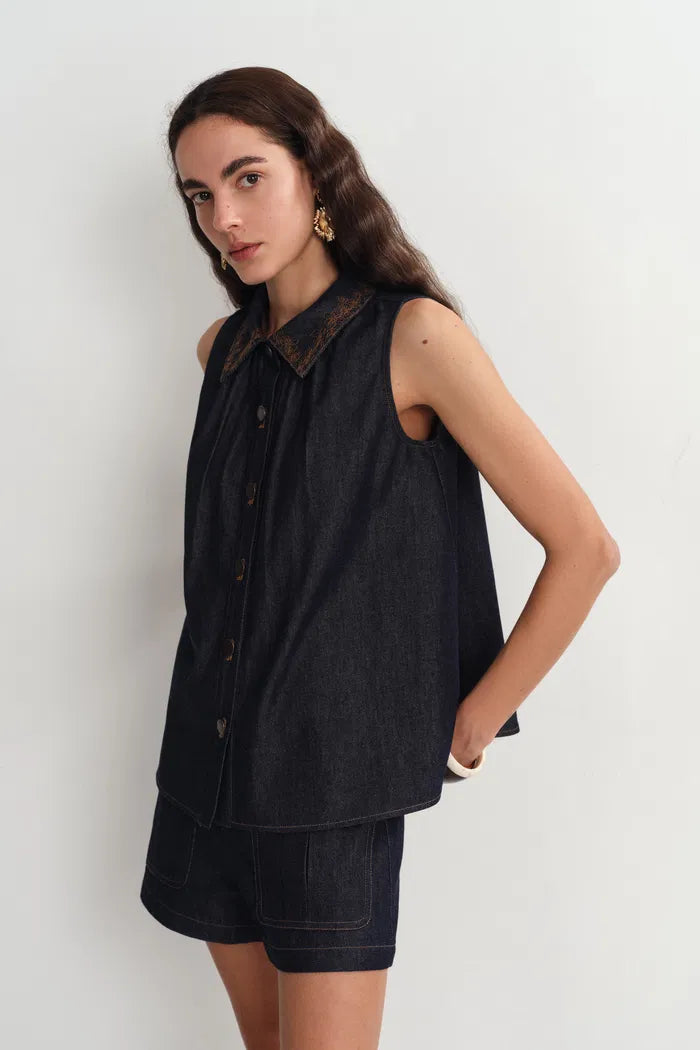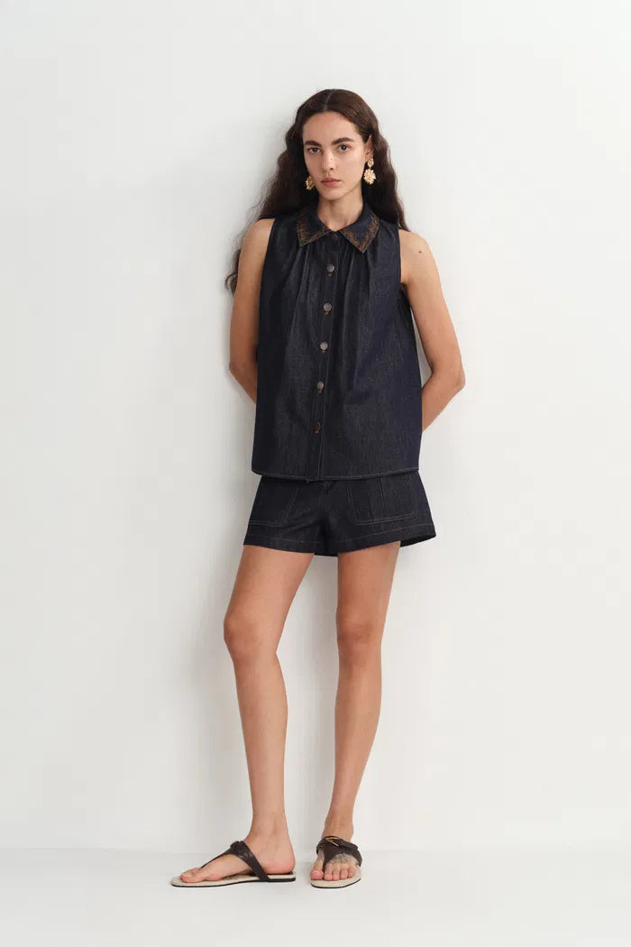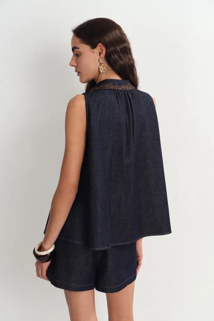 Zach Sleeveless Top and Shorts Matching Set in Silk-Cotton Denim