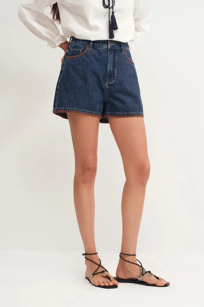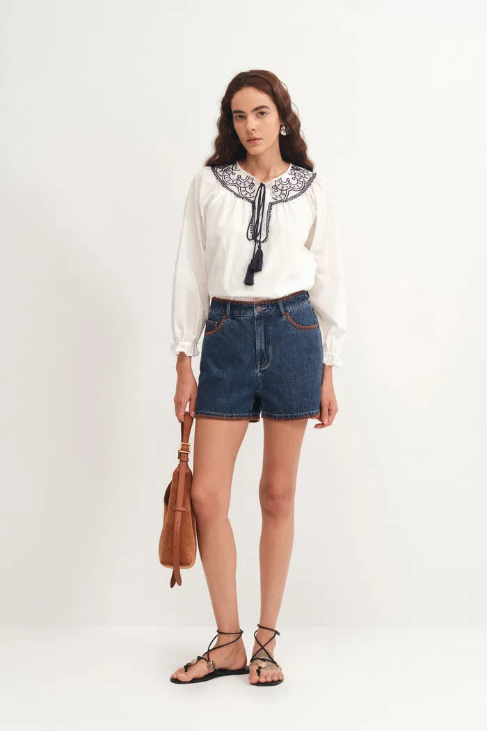 Anja Hand Embroidered Shorts in Cotton Denim