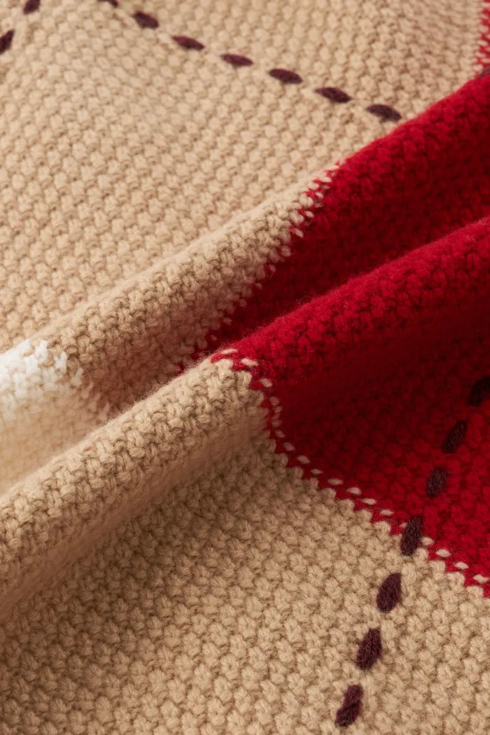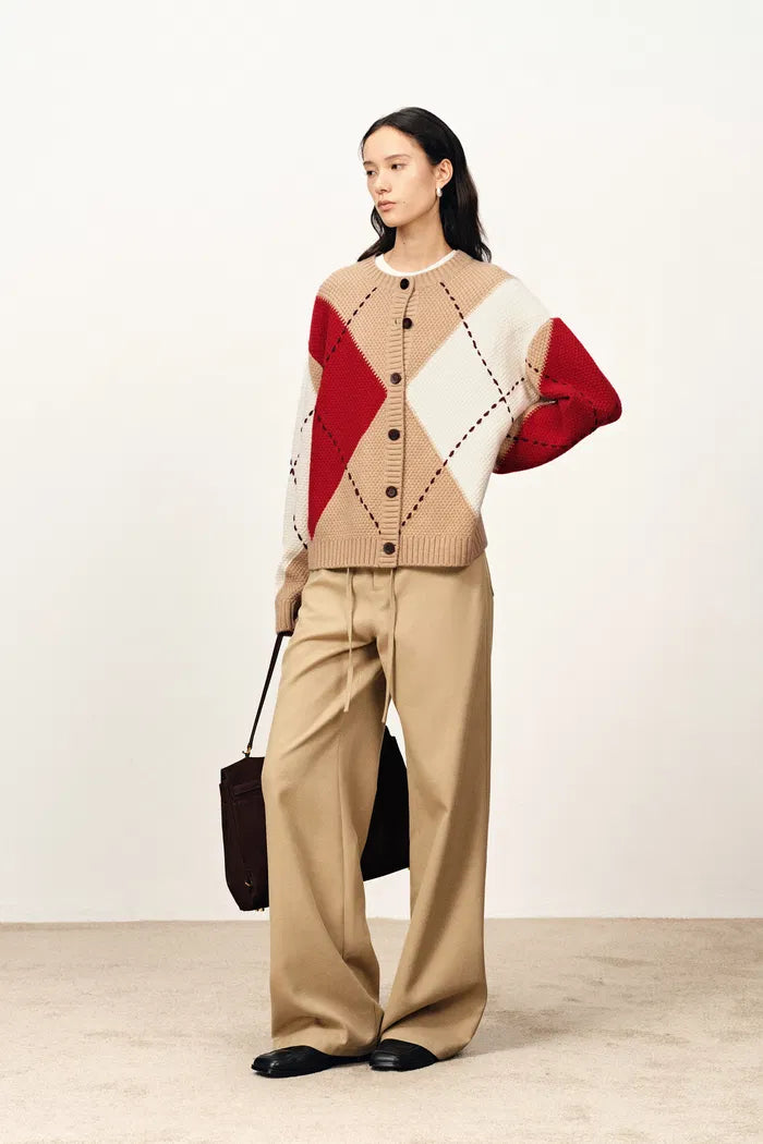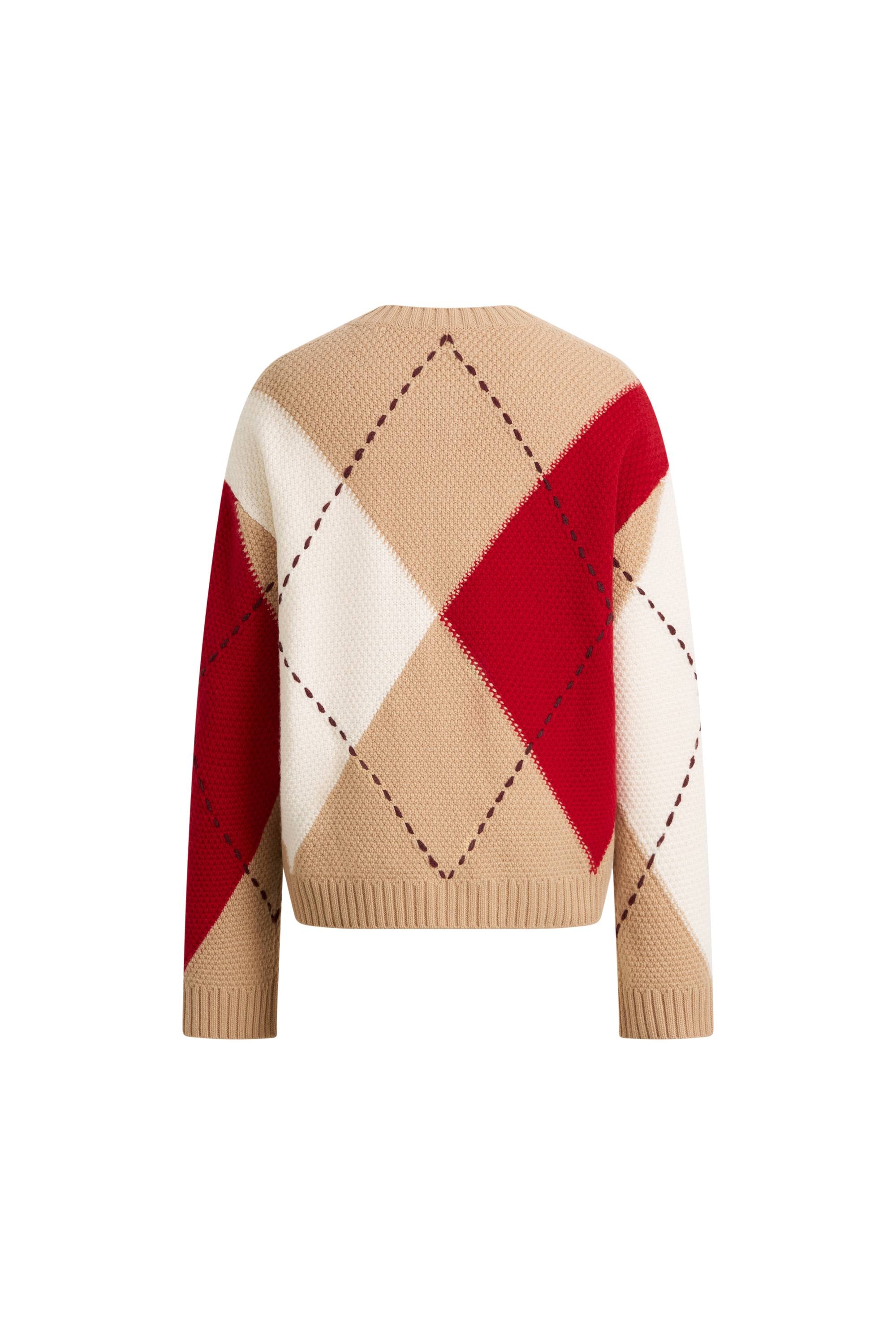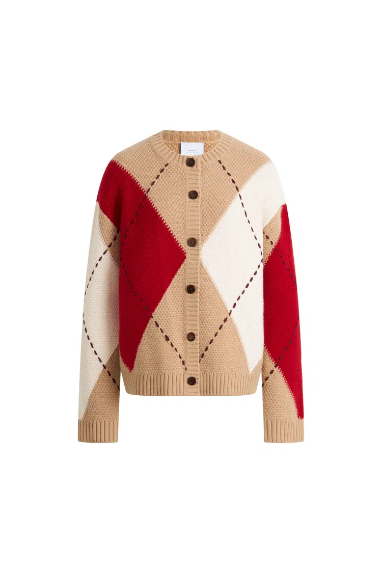 Luce Hand Embroidered Lines Large Plaid Cardigan in Merino Wool