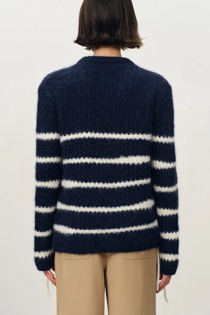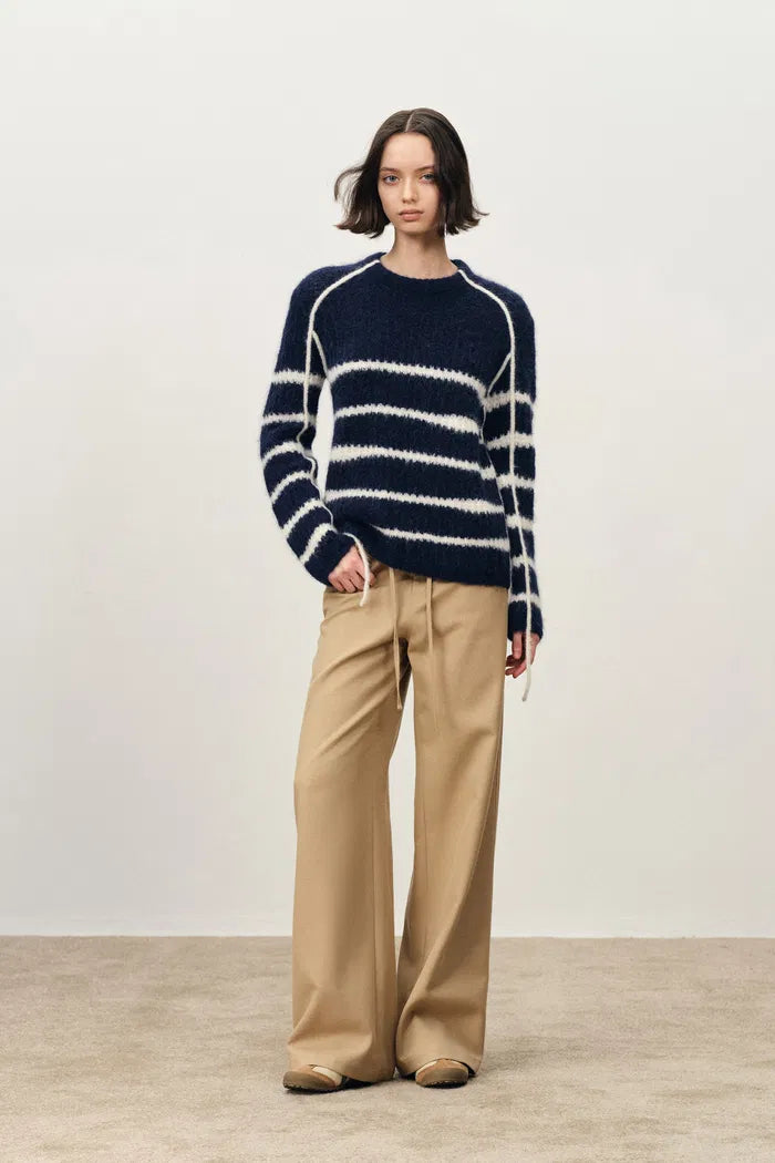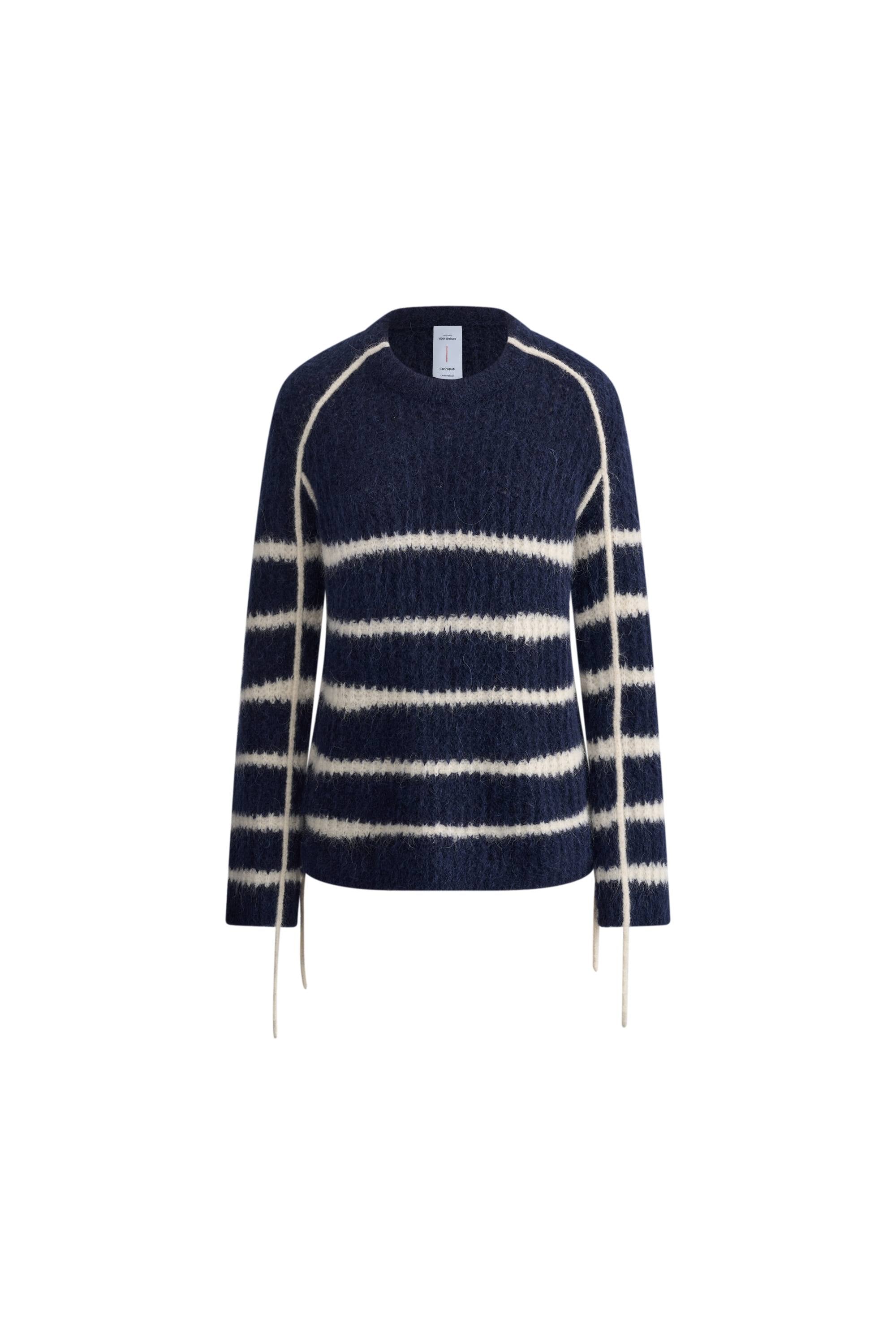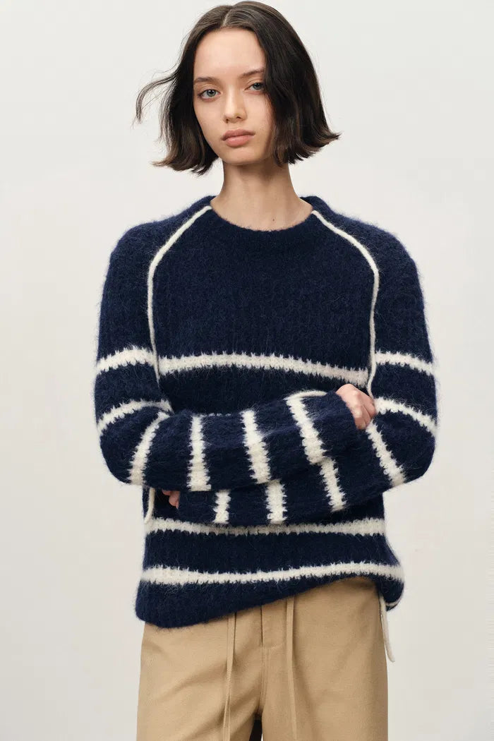 Same irregular stripe pattern in coordinating colorway creates collection continuity while deconstructed shoulders add contemporary edge. The wave-inspired pattern placement makes each sweater feel uniquely artistic rather than commercially produced.