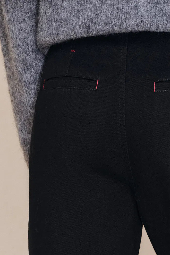 - Sculptural barrel-leg cut