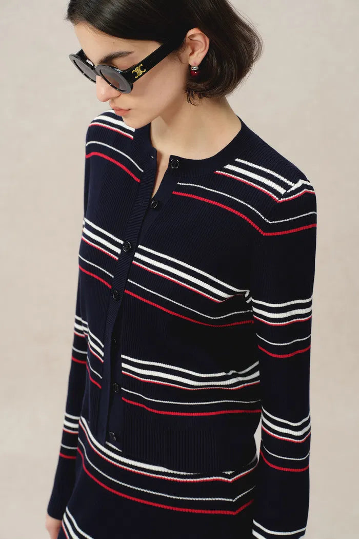 Nautical stripes play a fresh game in cotton-silk blend. Classic French tricolor gets a breezy update, while the fit stays smart. Your summer cardigan game just got elevated.