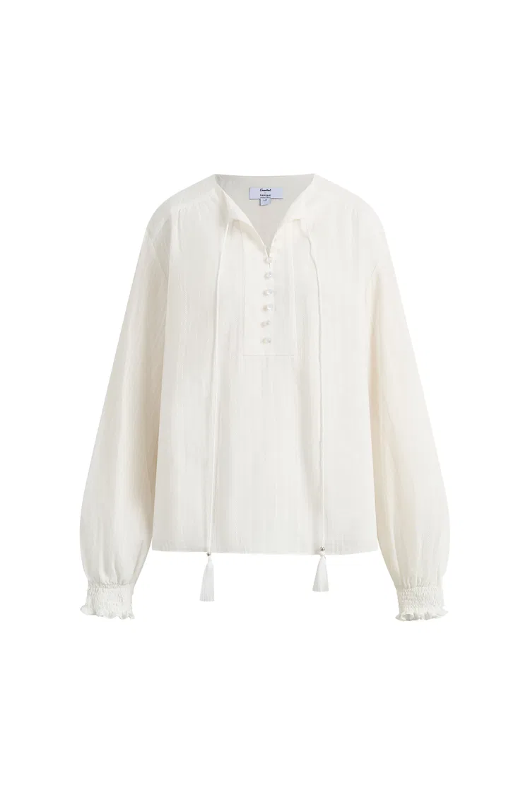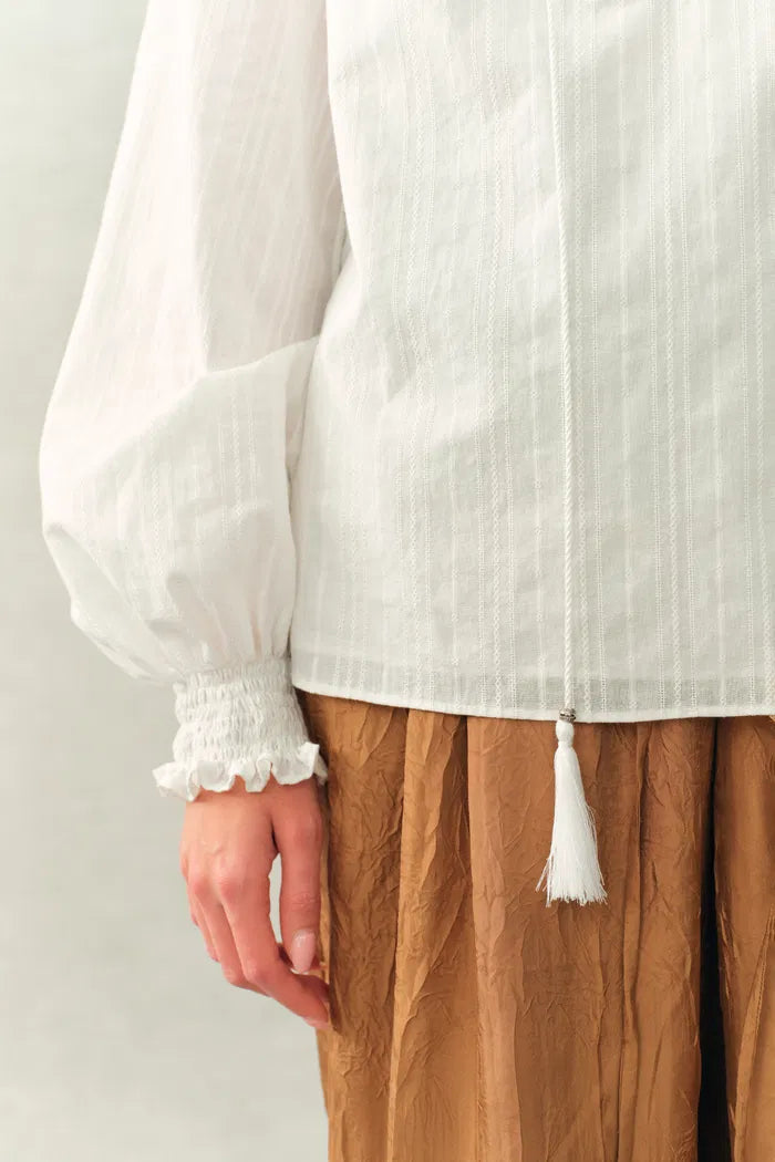 Crepus Striped Fringe-Tie French Shirt In Cotton Jacquard