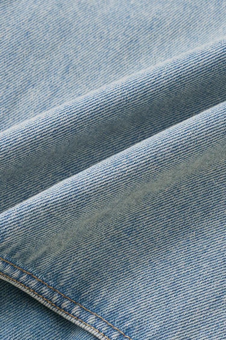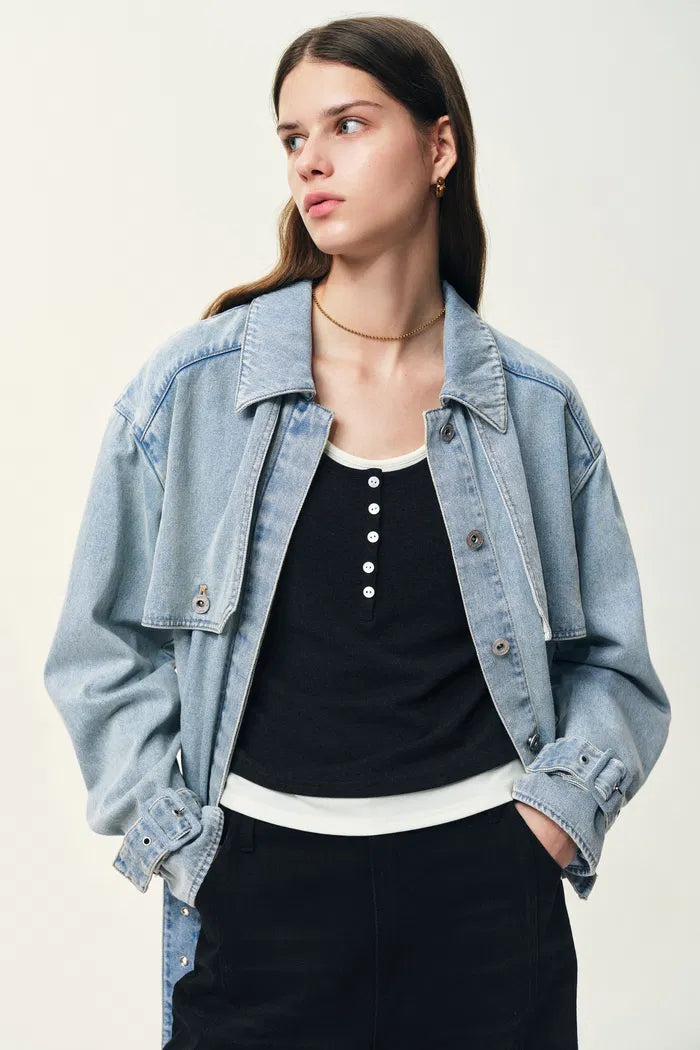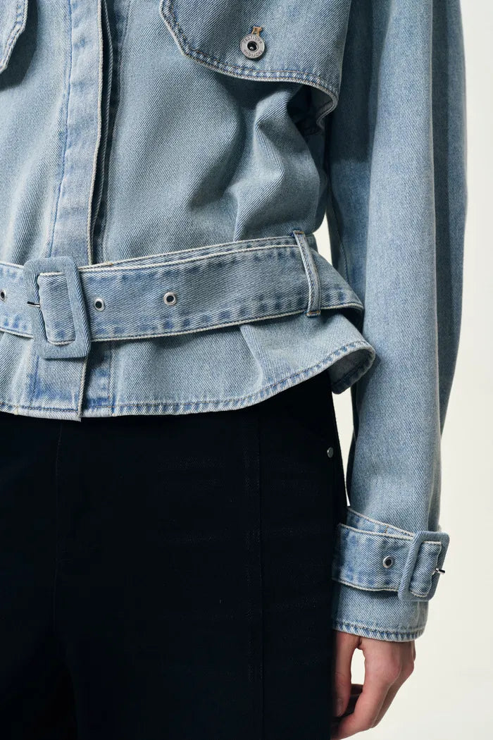 Halle Washed Short Trench Inspired Jacket in Light Blue Denim